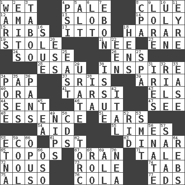 ACROSS 1. Soggy 4. Light colored 8. A slight indication 12. Wet nurse (var.) 13. Oscar Madison type 14. Many (prefix) 15. Chest bones 17. "Tell ____ the Marines!" 18. Ethiopian city, capital of Harari 19. Fur scarf 21. Born 23. Compass dir. 24. Boozer 26. Followers of ems 28. He sold his birthright 30. Stimulate to action 34. Infant food 37. Indian titles of respect 39. Roberta Peters solo 40. Mouth or opening 41. Tarsus (plural) 43. Raised railways 44. Transmitted 46. Drawn tight 47. Observe 48. Gist 51. Hearing organs 54. Help 55. Citrus fruits 58. Environmental prefix 61. Pacific Standard Time (abbr.) 63. Middle Eastern gold or silver currency 65. Literary convention 67. Northwest Algerian city 71. Story 72. Common sense 73. Hero or heavy, e.g. 74. Bar bill 75. In addition 76. Root beer relative 77. Begley and Asner DOWN 1. Armed conflicts 2. Sends forth 3. Off limits 4. Air pressure measure (abbr.) 5. Keyboard modifier key 6. Car dealer's back yard 7. Inky black, to poets 8. Accounting whiz (abbr.) 9. Old wives' tales, e.g. 10. Uhlan (variant) 11. Jane of fiction 16. Turn sharply 18. Coop moms 20. Double-curved letter 22. Car or cant ending 25. 90 degrees 27. Health resort 29. A salt of uric acid 30. Come out of 31. Angers 32. Cause heat under the collar 33. Relaxation 34. Introduce or present, as a question 35. Ancient Greek god of war 36. Zero-star reviews 38. Lyricist Gershwin 42. Slanted text style (abbr.) 45. Beverage made from leaves 49. Pinches, bites 50. Music discs 52. To free from 53. Stricken, poetically 56. Maternal 57. Vegetable dish 58. Inactive volcano in Sicily 59. Calm and collected 60. Musical composition 62. Torque (variant) 64. Confederate soldiers (slang) 66. Bear (Spanish) 68. Friend of Pooh 69. Everything 70. Teachers' org.