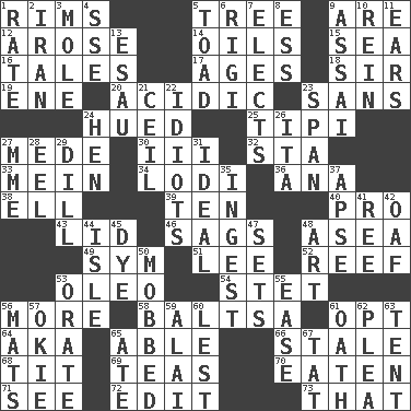 ACROSS 1. Basketball hoops 5. Woody plant 9. "We ___ not amused" (Victoria) 12. Came up 14. Lubricates 15. Ocean 16. Stories 17. Eons 18. Title for a knight 19. Compass dir. 20. Being or containing an acid 23. Without 24. Took on color 25. Native american tent (variation) 27. Ancient Persian 30. One more than two 32. R.R. building 33. Chow _ 34. Farming town in central California 36. Santa ___, CA 38. Pipe bend 39. "___ Little Indians" 40. Adept person 43. Hat (slang) 46. Settles 48. At sea 49. Symbol (abbr.) 51. Area sheltered from the wind 52. Coral collection 53. Margarine 54. Proofreading order 56. Greater amount 58. Greek mezzo-soprano Agnes 61. Elect 64. Alias (abbr.) 65. Competent 66. Lacking originality or spontaneity 68. Teat (slang) 69. Beverages made from leaves 70. Consumed 71. Observe 72. Prepare for publication 73. Not this but _ DOWN 1. Pace 2. SW Asia republic 3. Undercover agent 4. Compass dir. 5. Frog relative 6. Swiss mountan, "Queen of the Mountains" 7. Chooses 8. Curvy letter 9. Slender Brazilian palm 10. It's straight from the horse's mouth 11. Hearing organs 13. He sold his birthright 21. To provide with a ceiling 22. Foolish or stupid persons 23. Connect, as a bridge 24. Layer 26. Call ___ day 27. Madame (abbr.) 28. Snakelike fish 29. Deli pickle 31. Standard of perfection 35. Eat 37. Domed church section 41. Portuguese money of account (variant) 42. Clumsy lout 44. Small island 45. Color 47. Arranges properly for use 48. Nonscientific branch of learning 50. Crowded into 53. Declaim 55. Comfort 56. Floor protectors 57. Migrant worker of the '30s 59. Jai _ 60. For fear that 61. Pledge 62. Entreaty 63. Portable shelter 65. Had dinner 67. Make lace