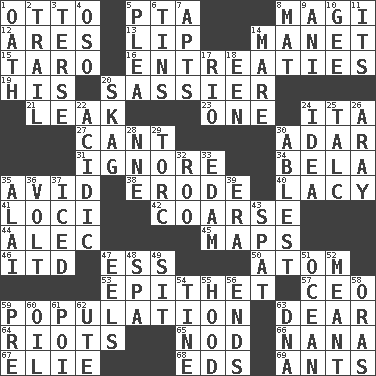 ACROSS 1. Von Bismarck 5. Parent Teacher Association (abbr.) 8. Wise men 12. Ancient Greek god of war 13. Mouth edge 14. French painter Edouard 15. Pacific island yam 16. Pleas 19. Part of HMS, perhaps 20. More lively and spirited 21. Path through which fluid escapes 23. Single 24. Call ___ day 27. Patter 30. The sixth month of the Jewish calendar 31. Dismiss 34. Actor Lugosi 35. Enthusiastic 38. Eat (away) 40. Made of lace 41. Event scenes 42. Rough 44. Actor Baldwin 45. Atlas contents 46. It would 47. Double-curved letter 50. Tiny particle 53. Curse 57. Corporate head (abbr.) 59. Census information 63. Letter starter 64. Disturbances 65. Dreamland 66. Nanny 67. Writer Wiesel 68. Begley and Asner 69. Pismires DOWN 1. Pledge 2. Drop behind 3. Laconic 4. Bear (Spanish) 5. Entreaty 6. Airtight sealed metal containers 7. Flats, for short 8. Floor protector 9. Cuckoo 10. Turn to the right 11. ___ a Wonderful Life 14. Female horse 17. _ de Janeiro 18. Car or cant ending 20. Heroin 22. Being or containing an acid 24. The main thing one is thinking about 25. Baby powder 26. Like ___ of sunshine 28. Compass dir. 29. Torque (variant) 30. Most capable 32. Friend of Pooh 33. Dutch treat 35. Jai _ 36. Electrical Unit 37. On the rocks 39. Epoch 43. Argument over a trivial matter 47. Snakelike fish 48. Health resort 49. Be seated 51. Sea 52. Intended 54. Prong on a fork 55. Parka part 56. Conclusions 58. Mouths or openings 59. Before (prefix) 60. Petroleum 61. Luau course 62. Shoshoni 63. Heredity factor (abbr.)