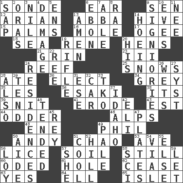 ACROSS 1. Something which is sent 6. Ewer handle 9. Elected rep. 12. Believer in; advocate of (suffix) 13. Swedish rock group 14. Hub of activity 15. Insides of hands 16. Undercover agent 17. Double curve, resembling the letter S 18. Ocean 19. French philosopher Descartes 20. Coop moms 21. Broad smile 23. One more than two 24. Coral ridge 25. Overwhelms 28. Had dinner 30. Opt 34. Jennifer or Joel 35. French article 36. 1973 Nobel Price Winner (Physics) Leo 38. ___ a Wonderful Life 39. In a ____ (agitated or irritated) 41. Eat (away) 43. Eastern Standard Time (abbr.) 44. More peculiar 46. High mountains 48. Compass dir. 49. Silvers or Donahue 50. "60 Minutes" Commentator Rooney 51. US Secretary of Labor Elaine L. _ 53. "___ Maria" 56. Louse (plural) 57. Land 58. Free from disturbance or agitation 60. Wrote a lyric poem 61. Hollow 62. Desist 63. Consenting reply 64. Pipe bend 65. Small island DOWN 1. Plant excrement 2. Mouths or openings 3. Mediterranean tributary 4. Break 5. Followers of ems 6. Inky black, to poets 7. Competent 8. Actress Charlotte 9. Seigniories (variant) 10. Nights before holidays 11. Born 13. So be it 14. Weeding 19. Ransack; plunder; pillage 20. Part of HMS, perhaps 22. Portuguese money of account (variant) 24. Homes 26. Moistens 27. System (abbr.) 28. In addition 29. Be inclined (to) 31. Compass dir. 32. Automobile 33. Ring climax 37. Potato state 40. Looked after 42. Biblical high priest 45. Marina Del _, California 47. Food holders 49. Light colored 50. Helper 51. Calm and collected 52. Land elevation 54. Small bottle 55. Otherwise 56. Myrna of the movies 57. A female animal or person 58. _-fi 59. Allow