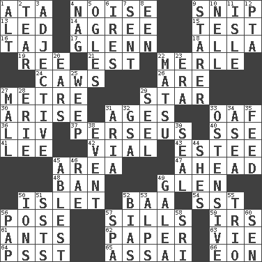ACROSS 1. "One Day ___ Time" 4. Annoying sound 9. Clip 13. Directed 14. Match 15. Trial 16. _ Mahal 17. American astronaut and politician John 18. Silent film actress Nazimova 19. To sift 21. Eastern Standard Time (abbr.) 22. Haggard of country music 24. Crow sounds 26. "We ___ not amused" (Victoria) 27. Distance measurement (Brit.) 29. Play the lead 30. Get up 31. Eras 33. Clumsy lout 36. 54 in ancient Rome 37. Son of Zeus who helped slay Medusa 40. Compass dir. 41. Area sheltered from the wind 42. Small bottle 43. First name in cosmetics 45. Type of rug 47. Having the leading position 48. Forbid 49. Small, secluded valley 50. Small island 52. Sound made by sheep 54. Fast jet (abbr.) 56. Airs 57. Beverly of Met fame 59. Big collection agency 61. Pismires 62. Some stationery 63. Compete 64. Inconspicuous attention getter 65. Slender Brazilian palm 66. A really long time DOWN 1. Keyboard modifier key 2. Lacerate 3. Descriptive word 4. Tired old horse 5. Stares at amorously 6. Angers 7. Transmitted 8. Car or cant ending 9. A viewer who gazes fixedly 10. 1994 drama film starring Jodie Foster 11. Small island 12. Parent Teacher Assoc. 20. Hearing organs 22. Taiwanese island in East China Sea 23. Epoch 25. Shed a tear 27. Shopping center 28. One of the Great Lakes 29. Sew up the eyelids of hawks and falcons 31. Operatic vocal solo 32. Girls' org. (abbr.) 33. Clearly or manifestly demonstrative 34. Toward the sea 35. Nourish 38. Happening 39. Lick closed 44. "______ My Girl" (Turtles hit) 45. Most capable 46. Actress Charlotte 49. An organ shaped like a helmet 50. Charged particles 51. Fast planes 52. Prejudice 53. High mountains 55. Musical group of three 56. Infant food 57. Health resort 58. _ Lanka 60. Elected rep.