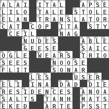 ACROSS 1. Mountain range southwest of Kyrgyzstan 5. Slanted text style (abbr.) 9. Domed church section 13. _ and Stitch 14. Lie 15. Took without asking 16. Style 17. Interpreter 19. Feline 20. Police officer (slang) 21. Call ___ day 22. Filthy place 23. To provide with a ceiling 25. Tired old horse 26. Unclothed pictures 30. Competent 34. Honkers 35. Ketch in the Levant 36. Stare at amorously 39. Erodes 42. Musical group of three 43. Perceives with the eye 44. Trap for birds or small mammals 46. Sudden quick movement 47. Echolocation 48. French article 51. One who uses or employs something 54. Connecticut Ivy Leaguer 57. _ tizzy (2 wds.) 58. Male parent 60. Pass on 62. Homes 65. Small Philippine buffalo 66. Table seasonings 67. Hyperbolic tangent 68. Floor coverings 69. Supplemented with great effort 70. Johnson of "Laugh-In" 71. Inconspicuous attention getter DOWN 1. Actor Baldwin 2. Pale purple color 3. Having winglike extensions 4. Electrically charged atom 5. "Tell ____ the Marines!" 6. Canvas cover 7. Chicken ___ king 8. Soviet premier 1918-24 9. _ moment's notice (2 wds.) 10. Cooking vessels 11. Narrow, elongated depression 12. Suggestive of the supernatural 15. Volcanic refuse 18. R.R. building 20. A slight indication 24. Swallow 27. Morning condensation 28. Compass dir. 29. Actors Connery and Penn 30. Michaelmas daisies 31. Long, evenly shaped piece 32. Cards in a Roman deck? 33. Environmental prefix 36. Order of Saint Francis (abbr.) 37. Set 38. Luau accessory 40. Friend of Pooh 41. Male child 45. Saudi Arabian king (1953-1964) 48. Hats (slang) 49. Compass dir. 50. Before Barbara or Clara 52. Ferber et al. 53. Disturbances 54. Celtic language 55. Path through which fluid escapes 56. Small island 58. Undesirable depression on a surface 59. American tennis player Robert 61. Compass direction 63. It would 64. 4-wheeled motor vehicle 65. Electrical Unit