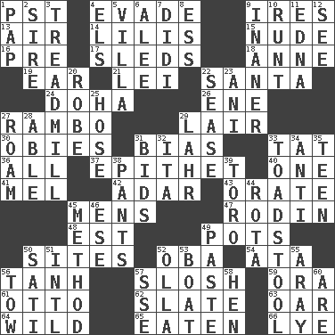 ACROSS 1. Pacific Standard Time (abbr.) 4. Dodge 9. Angers 13. Wind 14. Ms. Damita and namesakes 15. Unadorned 16. Before (prefix) 17. Bobsleighs 18. Queen of England 1702-14 19. Ewer handle 21. Luau accessory 22. Before Barbara or Clara 24. Capital of the state of Qatar 26. Compass dir. 27. Role for Stallone 29. Den 30. Off-Broadway awards 31. Prejudice 33. Make lace 36. Everything 37. Curse 40. Single 41. Cartoonist voice _ Blanc 42. The sixth month of the Jewish calendar 43. Speak pompously 45. Not women's 47. "The Thinker" sculptor 48. Eastern Standard Time (abbr.) 49. Cooking vessels 50. Settings 52. Chief or king in Benin or Nigeria 54. "One Day ___ Time" 56. Hyperbolic tangent 57. Agitate, as a liquid 59. Mouth or opening 61. Von Bismarck 62. Chalkboard 63. Rowing implement 64. Uncontrolled 65. Consumed 66. Sodium hydroxide DOWN 1. Infant food 2. Beget 3. Excercise machine 4. Raised railways 5. Country estate 6. Toward shelter 7. "You Light Up My Life" star Conn 8. Double-curved letter 9. More empty; more void 10. The smallest animal of a litter 11. Pulitzer Prize-winning author Ferber 12. Observe 20. Loose flowing garment 22. Gospel singer Marvin 23. Cuckoo 25. Flexible conduit 27. Wander 28. Competent 29. Cowardly lion portrayer 31. Auction offers 32. Call ___ day 33. Inedible or poisonous agaric 34. Opposed to 35. Adolescent 38. Leg coverings 39. "Corrida" creature 44. Roll call or roster of names 45. Mode 46. Compass dir. 49. Thick mixture 50. Suttee (variant) 51. International (abbr.) 52. Spanish pot 53. Water vessel 55. Like ___ of sunshine 56. Pull behind 57. Compass dir. 58. Layer 60. "We ___ not amused" (Victoria)