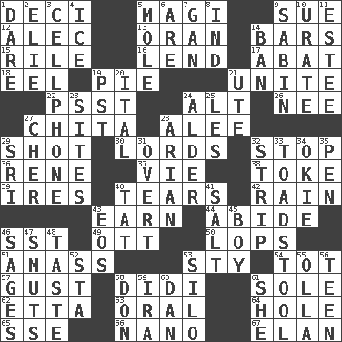 ACROSS 1. Tenth: prefix 5. Wise men 9. Take to court 12. Actor Baldwin 13. NW Algerian seaport 14. Long, evenly shaped pieces 15. Cause heat under the collar 16. Grant temporary use of 17. Blind as ____ 18. Snakelike fish 19. Sliced dessert 21. Join together 22. Inconspicuous attention getter 24. The first octave above the treble staff 26. Born 27. Riviera of "Kiss of the Spider Woman" 28. Toward shelter 29. Opportunity 30. Nobles 32. Constrict 36. French philosopher Descartes 37. Compete 38. Casino tip 39. Angers 40. Pulls into pieces 42. Water falling in drops from the sky 43. Merit 44. Stay 46. Fast jet (abbr.) 49. Baseball player Mel 50. Chops off 51. Collect or gather 53. Filthy place 54. Small child 57. Abrupt rush of wind 58. "You Light Up My Life" star Conn 61. Flatfish 62. Singer James 63. Of the mouth 64. Opening into or through something 65. Compass dir. 66. Billionth: prefix 67. Liveliness DOWN 1. Have the gumption 2. Writer Wiesel 3. Portable communications device 4. Frozen water 5. Undercover agent 6. "We ___ not amused" (Victoria) 7. Separate the seeds from cotton 8. Indiana (abbr.) 9. Unit of acoustic absorption 10. A salt of uric acid 11. First name in cosmetics 14. Forbid 19. Pacific Standard Time (abbr.) 20. Slanted text style (abbr.) 21. Shoshoni 23. Locates 24. Tree or shrub in the Birch family 25. French article 27. "Mermaids" star 28. Believer in; advocate of (suffix) 29. Indian title of respect (Mr.) 31. Unconcealed 32. Empty completely 33. Inedible or poisonous agaric 34. Migrant worker of the '30s 35. Writing instrument 40. Make lace 41. Table seasoning 43. Greek goddess of the dawn 45. Male child 46. Gurus 47. Obscenities 48. Clothes sense 52. R.R. building 53. Grain storage tower 55. Water jar 56. Adolescent 58. Spanish title 59. Retirement account (abbr.) 60. Daniel's nick name 61. A female animal or person