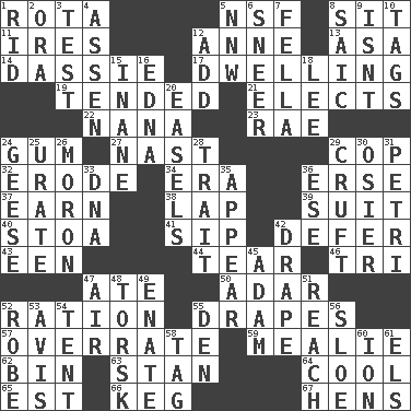 ACROSS 1. Round or rotation of duties 5. Overdraft (abbr.) 8. Be seated 11. Angers 12. Singer Murray 13. White ___ sheet 14. Hyrax 17. Home 19. Watched over 21. Opts 22. Grandmother 23. Actress Charlotte 24. Chewing product 27. Political cartoonist Thomas 29. Police officer (slang) 32. Eat (away) 34. Epoch 36. Celtic language 37. Merit 38. Infant locale 39. Set of matching outer garments 40. Portico 41. Small drink 42. Put off 43. Car or cant ending 44. Separate forcefully 46. Three (prefix) 47. Had dinner 50. The sixth month of the Jewish calendar 52. Food allowance for one day 55. Window treatments 57. Make much ado about nothing 59. Ear of corn 62. Storage container 63. Comedian Laurel of Laurel & Hardy 64. Calm and collected 65. Eastern Standard Time (abbr.) 66. Barrel 67. Coop moms DOWN 1. To free from 2. Mouth or opening 3. Trial 4. NE Netherlands city 5. Compass dir. 6. Scornful expression 7. Man or boy (slang) 8. Ketch in the Levant 9. Is not 10. Labels 12. Find the sum of 15. Lacking in sense or substance 16. Pulitzer Prize-winning author Ferber 18. Area sheltered from the wind 20. Artist's stands 24. Honkers 25. A salt of uric acid 26. Person of subnormal intelligence 28. Distinguishing feature 29. An unpleasant substance 30. Flexible twig of a willow tree 31. _ dish (used to culture cells) 33. Heredity factor (abbr.) 35. Seem 36. Compass dir. 42. Window treatment 45. First of billions? 47. Wind 48. Cod relative 49. Related on the mother's side 51. Arrive at 52. Loose flowing garment 53. Advice 54. Portable shelter 55. Lair 56. A type of plum 58. Label 60. Electrically charged atom 61. Raised railways
