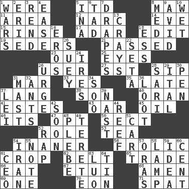 ACROSS 1. Past tense of be (plural) 5. It would 8. Informal term for the mouth 11. Length times width 12. Drug cop 14. First lady 15. Wash lightly 17. The sixth month of the Jewish calendar 18. Prepare for publication 19. Spring feasts 21. Went by 23. Fr. "Yes" 25. Snake ____ (dice throw) 26. One who makes use of a thing 27. Fast jet (abbr.) 28. Small drink 31. Make imperfect 33. Consenting reply 35. Having winglike extensions 37. Austrian-born American filmmaker Fritz 38. Boy, to dad 40. Northwest Algerian city 41. _____ Park, CO 43. Boat paddle 45. Lubricate 46. It is 47. Choose 50. Religious group 52. Hero or heavy, e.g. 53. Afternoon social gathering 54. Sillier 56. Romp 61. Riding implement 62. Waist strap 65. Exchange 66. Ingest 67. Needle holder 68. So be it 69. Single 70. A really long time 71. Argument over a trivial matter DOWN 1. Armed conflicts 2. One of the Great Lakes 3. Tear apart 4. Comfort 5. _ tizzy (2 wds.) 6. Bit 7. Window treatments 8. Ancient Persian 9. Enthusiastic 10. Dripping 13. Trading vessels 16. Greek god of love 18. Double-curved letter 20. Chop _ 22. Stalk of a moss capsule 24. Angers 26. Goad 28. Indian skirt 29. Slanted text style (abbr.) 30. Fenced enclosure 31. Vertical spar for supporting sails 32. Pismires 34. "Barney Miller" actor Jack 36. Spoils 37. Flowery wreath 39. Political cartoonist Thomas 42. Within a short period 44. Coral collection 48. Military trainee 49. Cylindrical with tapered ends 51. Haul 52. Hit sharply and swiftly 54. SW Asia republic 55. Brief written record 57. Mouths or openings 58. Desk light 59. The content of cognition 60. Penny 61. Corporate head (abbr.) 63. Nilotic language 64. Shallow baking pan