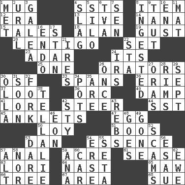 ACROSS 1. Java container 4. Fast planes 8. A whole individual unit 12. Epoch 13. Not recorded 14. Nanny 15. Lies 18. ____ Jay Lerner 19. Abrupt rush of wind 20. Small, flat, pigmented spot on the skin 22. Arrange properly for use 23. The sixth month of the Jewish calendar 24. It is 25. Single 26. Speakers 30. Order of Saint Francis (abbr.) 33. Connects, as a bridge 36. 4th largest of the Great Lakes 37. Plunder 39. The grampus (Milton) 40. Moist 41. Old wives' tales, e.g. 42. Bull 44. Fast jet (abbr.) 45. Short socks 47. Oval reproductive body of a fowl 50. Myrna of the movies 51. Expressions of contempt or scorn 53. One of the 12 tribes of Israel 54. Core 57. Of or related to the anus 59. Measure of real estate 61. Gospel singer Marvin 63. Australian parrot (variant) 64. Political cartoonist Thomas 65. Opening into something insatiable 66. Family _ (genealogy) 67. Length times width 68. Institute legal proceedings DOWN 1. Was introduced to 2. Mountain range 3. An organ shaped like a helmet 4. Volcanic refuse 5. Grain storage tower 6. Federal power corp. 7. Elected rep. 8. Consumed 9. Tense 10. Followers of ems 11. Floor covering 16. Inside; within (prefix) 17. Comedian Laurel of Laurel & Hardy 21. Angers 22. R.R. building 24. Big collection agency 26. At one time in the past 27. Mouths or openings 28. Basketball hoops 29. Back-to-school mo. 30. Rounded earthenware pot or jar 31. Within a short period 32. Tined utensil 34. Cooking vessels 35. "We ___ not amused" (Victoria) 38. Copy Pinocchio 42. Filthy place 43. Confederate soldiers (slang) 46. A really long time 48. Moves 49. Went 52. Fraudulent business schemes 53. Have the gumption 54. Celtic language 55. Bristle 56. Son of Isaac 57. The first octave above the treble staff 58. And not 59. Santa ___, CA 60. Automobile 62. She-sheep