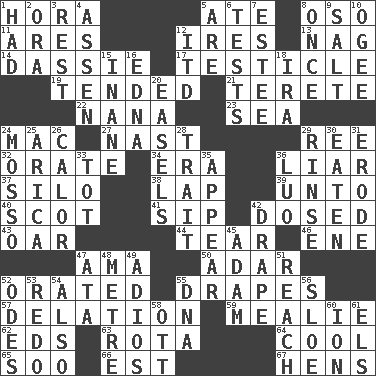 ACROSS 1. Israeli folk dance 5. Had dinner 8. Bear (Spanish) 11. Ancient Greek god of war 12. Angers 13. Tired old horse 14. Hyrax 17. A testis 19. Looked after 21. Cigar-shaped 22. Grandmother 23. Ocean 24. Apple computer (short form) 27. Political cartoonist Thomas 29. To riddle 32. Speak pompously 34. Period 36. One who doesn't tell the truth 37. Grain storage tower 38. Pet locale 39. To (old English) 40. Highlander 41. Small drink 42. Administered medicine 43. Rowing implement 44. Pull into pieces 46. Compass dir. 47. Nanny (var.) 50. The sixth month of the Jewish calendar 52. Spoke pompously 55. Window treatments 57. Accusation by an informer 59. Ear of corn 62. Begley and Asner 63. Round or rotation of duties 64. Calm and collected 65. "Barney Miller" actor Jack 66. Eastern Standard Time (abbr.) 67. Coop moms DOWN 1. Possessed 2. Mouth or opening 3. Take ten 4. NE Netherlands city 5. "We ___ not amused" (Victoria) 6. Trials 7. First name in cosmetics 8. Single time 9. Table seasoning 10. Double curve, resembling the letter S 12. It would 15. Empty; void 16. Pulitzer Prize-winning author Ferber 18. Retirement account (abbr.) 20. Artist's stands 24. With motion or animation 25. N. Chile seaport 26. Bodily heat indicating an inflammation 28. Distinguishing feature 29. Remove soap 30. Eroded 31. Wear away 33. Small child 35. Seem 36. Nilotic language 42. Window treatment 45. First man 47. _ moment's notice (2 wds.) 48. Distance measurement (Brit.) 49. Goodbye (Sp.) 51. Arrive at 52. Lyric poems 53. Redecorate 54. In addition 55. Heredity factor (abbr.) 56. A type of plum 58. Baseball player Mel 60. Electrically charged atom 61. Raised railways