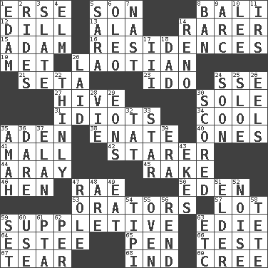 ACROSS 1. Celtic language 5. Manchild 8. Indonesian resort city 12. Deli pickle 13. Wing 14. More valued for its uncommonness 15. First man 16. Dwellings 19. Was introduced to 20. Of or relating to Laos or its people 21. Stalk of a moss capsule 23. Wedding promise 24. Compass dir. 27. Hub of activity 30. Flatfish 31. Foolish or stupid persons 34. Calm and collected 35. Arabian gulf 38. Maternal 40. Singles 41. Shopping center 42. A viewer who gazes fixedly 44. Like ___ of sunshine 45. Libertine 46. Layer 47. Actress Charlotte 50. Paradise 53. Speakers 57. Car dealer's back yard 59. Supplying deficiencies 63. Singer Brickell 64. First name in cosmetics 65. Writing instrument 66. Trial 67. Rend 68. Indiana (abbr.) 69. Algonquian DOWN 1. Dutch treat 2. Amusement-park features 3. Schedule 4. Shade tree 5. "Two Mules for Sister ____" 6. Margarine 7. Political cartoonist Thomas 8. Forbid 9. Curve 10. Area sheltered from the wind 11. Big collection agency 14. Former U.S. Attorney General Janet 17. One more than two 18. June honoree 20. Put down 22. Without thickness 24. Within a short period 25. _ gin 26. Snakelike fish 28. Compete 29. Immeasurably long periods of time 30. Tallied 32. Make lace 33. Play the lead 35. Nanny 36. Have the gumption 37. Style 39. Period 43. Makes supply last 47. Hero or heavy, e.g. 48. "We ___ not amused" (Victoria) 49. Consume 51. A person who is older than you are 52. Annoying sound 54. Native american tent (variation) 55. Baking chamber 56. Tear apart 58. Wig 59. Put into a specified state 60. Purpose 61. Parent Teacher Association (abbr.) 62. For each 63. And so on (abbr.)