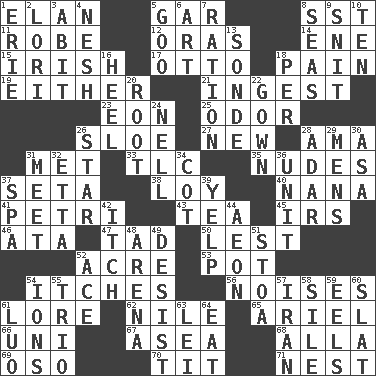 ACROSS 1. Enthusiasm 5. Slender fish 8. Fast jet (abbr.) 11. Loose flowing garment 12. Mouths or openings 14. Compass dir. 15. From or relating to Ireland 17. "Beetle Bailey" pooch 18. Ache 19. One or the other 21. Consume 23. Period of immesurable duration 25. Aroma 26. A type of plum 27. ___ Haven, CT 28. Nursemaid (var.) 31. Was introduced to 33. Affectionate concern, for short 35. Unclothed pictures 37. Bristle 38. Myrna of the movies 40. Grandmother 41. _ dish (used to culture cells) 43. Afternoon social gathering 45. Big collection agency 46. "One Day ___ Time" 47. Small amount or degree 50. For fear that 52. 43,560 square feet 53. Plant holder 54. Skin irritations 56. Annoying sounds 61. Old wives' tales, e.g. 62. "Death on the ____" 65. Satellite of Uranus 66. University (slang) 67. At sea 68. Silent film actress Nazimova 69. Bear (Spanish) 70. Teat (slang) 71. A home for chicks DOWN 1. One of the Great Lakes 2. Australian parrot (variant) 3. "This won't hurt ____!" 4. Delicate 5. Thick or sticky substance 6. Nonscientific branch of learning 7. Food allowance for one day 8. Oceans 9. In a ____ (agitated or irritated) 10. "___ Little Indians" 13. Message 16. Person who is morally reprehensible 18. For each 20. Carrot, for example 22. Long dress 24. 1994 drama film starring Jodie Foster 26. Play the lead 28. The sixth month of the Jewish calendar 29. Not women's 30. White ___ sheet 31. Confront 32. Singer James 34. Small bed 36. A single undivided whole 37. Health resort 39. Sharp bark 42. Hankering 44. Period of immesurable duration 48. Sports stadium 49. Stop 51. Portico 52. Adept person 54. Charged atoms 55. Musical group of three 57. SW Asia republic 58. Drop; flow; fall 59. Snakelike fish 60. Narrow board 61. Nilotic language 63. Flowery wreath 64. Ingest