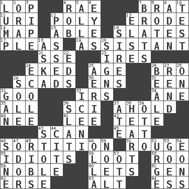 ACROSS 1. Trim (branches) 4. Actress Charlotte 7. Naughty child 11. RI univ. 12. Much (prefix) 13. Wear away 14. Atlas unit 15. Competent 16. Chalkboards 17. Entreaties 19. Helper 21. Compass dir. 23. Angers 24. Made supply last 25. Ripen 26. Sis' sibling 29. Heaps 30. Followers of ems 31. Car or cant ending 32. Thick or sticky substance 33. Big collection agency 34. A saturated hydrocarbon 35. Everything 36. _-fi 37. Hold, grip (Informal) 40. Born 41. Area sheltered from the wind 42. False hair 43. Examine minutely or intensely 45. Erode 46. Casting lots 51. Makeup applied to the cheeks 55. Foolish or stupid persons 56. Spoils 58. Friend of Pooh 59. Impressive in appearance 60. Allows 61. Commissioned military rank (abbr.) 62. Celtic language 63. Keyboard modifier key 64. Curvy letter DOWN 1. Mass 2. Relating to the mouth 3. Corncob 4. Director Reiner 5. Silent film actress Nazimova 6. Snake ____ (dice throw) 7. Naughty children 8. Round or rotation of duties 9. Arabian gulf 10. Trial 12. Went by 13. Otherwise 16. Fathers 18. "____ silly question..." 20. Attaches a signature 22. Begley and Asner 24. Learning spot: Fr. 25. Nest on high 26. Memphis, Tenn. Street 27. Tear apart 28. Single 29. Not divided or shared with others 32. Separate the seeds from cotton 33. Ancient Celtic tribe of eastern Britain 36. Narrow boards 37. Had dinner 38. Centers 39. "Beetle Bailey" pooch 43. Took without asking 44. Quote 46. Trig term 47. Aroma 48. Chest bones 49. Water jar 50. Christmas carol 52. Goad 53. Leaves 54. Immeasurably long periods of time 57. Baseball player Mel