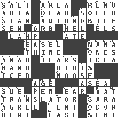 ACROSS 1. Table seasoning 5. Type of rug 9. Former U.S. Attorney General Janet 13. Roberta Peters solo 14. Letter starter 15. Having a sole or soles 16. Thailand, formerly 17. Form of transportation 19. Elected rep. 20. Globe 21. Cartoonist voice _ Blanc 22. Raised railways 23. Desk light 25. Had dinner 26. Artist's stand 30. Nanny 34. One or ones belonging to thee 35. Washington bills 36. Housemaid 39. Lacerates 42. It may be bright or harebrained 43. Billionth: prefix 44. Debaucheries 46. On the rocks 47. Trap for birds or small mammals 48. Mature 51. Toward the sea 54. Institute legal proceedings 57. Fenced enclosure 58. Hearing organ 60. Large container 62. Interpreter 65. "Two Mules for Sister ____" 66. Match 67. Portable shelter 68. Aroma 69. Monthly bill 70. Relaxation 71. Posted DOWN 1. Backtalk 2. Satellite of Uranus 3. Woody, climbing, usually tropical plant 4. Scottish cap 5. The sixth month of the Jewish calendar 6. Reuben's nickname 7. Ingest 8. Odor 9. Director Reiner 10. Writer Wiesel 11. 1994 drama film starring Jodie Foster 12. Lyric poems 15. Not divided or shared with others 18. Was introduced to 20. Brightly colored fish 24. Mode 27. Be seated 28. Compass dir. 29. Memorize 30. Annoying sounds 31. Also 32. Born 33. White ___ sheet 36. Black tropical American cuckoo 37. Apple computer (short form) 38. One (Scot) 40. River (Sp.) 41. "Barney Miller" actor Jack 45. Russian ruler of old 48. Domed church section 49. Set 50. Related on the mother's side 52. Dodge 53. Composer Copland 54. Play the lead 55. Goad 56. Merit 58. Immeasurably long periods of time 59. Johnson of "Laugh-In" 61. Small pie 63. Remaining after all deductions 64. Beverage made from leaves 65. Distress signal