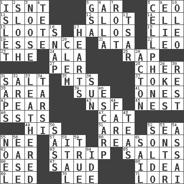 ACROSS 1. Is not 5. Slender fish 8. Corporate head (abbr.) 11. _ gin 12. Narrow opening 14. Pipe bend 15. Plunders 17. Rings 18. Whopper 19. Center 21. _ moment's notice (2 wds.) 22. Lion 23. Definite Article 24. In the manner of 25. Strike 27. For each 28. "Mermaids" star 31. Table seasoning 35. Mountains (abbr.) 37. Casino tip 38. Type of rug 39. Take to court 41. Washington bills 42. Lightbulb-shaped fruit 43. Overdraft (abbr.) 45. Egg locale 46. Fast planes 47. Domesticated feline 49. Part of HMS, perhaps 51. "We ___ not amused" (Victoria) 52. Ocean 55. Born 57. Small island 60. Thinks logically 62. Rowing implement 63. Empty completely 65. Table seasonings 66. Compass dir. 67. Saudi Arabian king (1953-1964) 68. The main thing one is thinking about 69. Directed 70. Area sheltered from the wind 71. Australian parrot (variant) DOWN 1. Small island 2. Agitate, as a liquid 3. Trap for birds or small mammals 4. False hair 5. Girls' org. (abbr.) 6. Silent film actress Nazimova 7. Carrot, for example 8. Portable communications device 9. Writer Wiesel 10. Butter sub 13. Russian ruler of old 16. Fastener 17. Centers 20. Clement's nick name 26. 13-14th century defensive garment 29. Makes supply last 30. Repose 31. Plant excrements 32. Ancient Greek god of war 33. Resembling or made to resemble leather 34. Tarsus (plural) 36. Player for Phoenix 40. Fortification 44. Conductor's collection 48. Beverages made from leaves 50. Backtalk 52. Twentieth part of a lira 53. Keyboard key 54. Slender Brazilian palm 55. Christmas carol 56. Relaxation 58. Slanted text style (abbr.) 59. Loyal 61. Travel by water 64. Binary compound