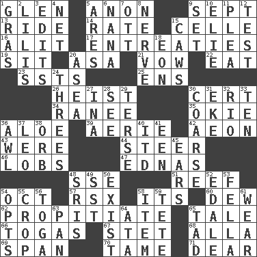 ACROSS 1. Small, secluded valley 5. Soon (poet.) 9. Back-to-school mo. 13. Travel on or in a vehicle 14. Assign a rank or rating to 15. Cell (Danish) 16. Set down 17. Pleas 19. Be seated 20. White ___ sheet 21. Solemn pledge 22. Erode 23. Fast planes 25. Followers of ems 26. Robbery 30. Sure thing 34. The wife of a rajah (variant) 35. Migrant worker of the '30s 36. _ vera 39. Nest on high 42. A really long time 43. Past tense of be (plural) 44. Navigate 46. Tennis shots 47. Ferber et al. 48. Compass dir. 51. Coral ridge 54. Sep. follower 57. Acura sports coupe 58. ___ a Wonderful Life 60. Morning condensation 62. Conciliate 65. Story 66. Ancient Roman robes 67. Proofreading order 68. Silent film actress Nazimova 69. Connect, as a bridge 70. Docile 71. Letter starter DOWN 1. Pate de foie ____ 2. Ms. Damita and namesakes 3. Prepares for publication 4. Remaining after all deductions 5. Ancient Greek god of war 6. Nanny 7. Baseball player Mel 8. Impudent aggressiveness 9. Arrange properly for use 10. Writer Wiesel 11. Entreaty 12. Trial 15. Crow sounds 18. A really long time 20. At sea 24. Triads 27. _ tizzy (2 wds.) 28. Observe 29. Laconic 30. Unrefined 31. Make supply last 32. River (Sp.) 33. "___ Little Indians" 36. Leather borer 37. Lion 38. Globe 40. It would 41. Car or cant ending 45. Hearing organs 48. Indian titles of respect 49. Fast jet (abbr.) 50. Be 52. Peak District village in England 53. Chap (slang) 54. Elects 55. Riding implement 56. Ancient Roman robe 58. A whole individual unit 59. Wig 61. Erode 63. Baking dish 64. _ moment's notice (2 wds.) 65. Bit