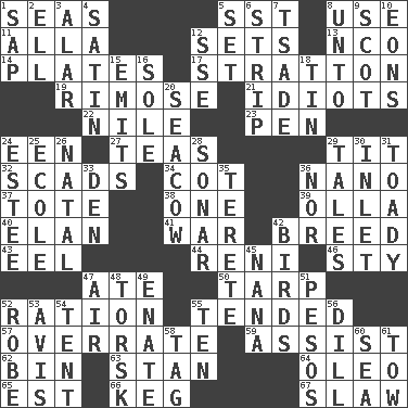 ACROSS 1. Oceans 5. Fast jet (abbr.) 8. Purpose 11. Silent film actress Nazimova 12. Puts into a specified state 13. Non-commissioned officer (abbr.) 14. Food holders 17. Ski resort town in Vermont 19. Full of chinks, cracks, or crevices 21. Foolish or stupid persons 22. "Death on the ____" 23. Writing instrument 24. Car or cant ending 27. Beverages made from leaves 29. Teat (slang) 32. Oodles 34. Small bed 36. Billionth: prefix 37. Haul 38. Single 39. Rounded earthenware pot or jar 40. Liveliness 41. Armed conflict 42. A special lineage 43. Snakelike fish 44. Painter Guido (1575-1642) 46. Filthy place 47. Had dinner 50. Canvas cover 52. Food allowance for one day 55. Watched over 57. Make much ado about nothing 59. Help 62. Storage container 63. Comedian Laurel of Laurel & Hardy 64. Margarine 65. Eastern Standard Time (abbr.) 66. Cask 67. Cole _ (cabbage dish) DOWN 1. Plant excrement 2. Pipe bend 3. Having or resembling wings 4. Smooth fabric 5. Put into a specified state 6. Empty completely 7. Sadhe (variant) 8. To (old English) 9. Native of Scotland 10. Immeasurably long periods of time 12. Compass dir. 15. Gives off 16. Not divided or shared with others 18. Metal container 20. Manatee 24. First name in cosmetics 25. Learning spot: Fr. 26. Relating to or accompanying birth 28. Underwater navigation system 29. Stories 30. An arm off of a larger body of water 31. Sycophant 33. Lair 35. Cylindrical with tapered ends 36. And not 42. Avian creatures 45. Grandmother 47. Atmosphere 48. Cod relative 49. Maternal 51. Mexican monetary units 52. Loose flowing garment 53. Opinion 54. Portable shelter 55. "___ Little Indians" 56. Deli pickle 58. Label 60. Ocean 61. Pull behind