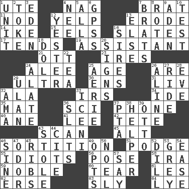 ACROSS 1. Shoshoni 4. Tired old horse 7. Naughty child 11. Dreamland 12. Sharp bark 13. Eat (away) 14. D.D.E's nickname 15. Snakelike fish 16. Chalkboards 17. Looks after 19. Helper 21. Baseball player Mel 23. Angers 24. Toward shelter 25. Grow older 26. "We ___ not amused" (Victoria) 29. Extreme 30. Followers of ems 31. 54 in ancient Rome 32. Chicken ___ king 33. Big collection agency 34. Binary compound 35. Floor protector 36. _-fi 37. Give a jingle 40. A saturated hydrocarbon 41. Area sheltered from the wind 42. False hair 43. Skim 45. The first octave above the treble staff 46. Decision 51. Plash 55. Foolish or stupid persons 56. Airs 58. Retirement account (abbr.) 59. Impressive in appearance 60. Lacerate 61. French article 62. Celtic language 63. Playfully artful 64. Sodium hydroxide DOWN 1. A single undivided whole 2. Puff or smoke 3. Genesis locale 4. Born 5. Silent film actress Nazimova 6. Global Positioning Systems (abbr.) 7. Naughty children 8. Roll call or roster of names 9. An important port of Yemen 10. Trial 12. Last past 13. Otherwise 16. Begets 18. Dunce 20. Omens 22. Afternoon social gathering 24. Having winglike extensions 25. Nest on high 26. Place in a line 27. Travel on or in a vehicle 28. Night before a holiday 29. ____ Bator 32. Wet nurse (var.) 33. Ancient Celtic tribe of eastern Britain 36. Narrow boards 37. Parent Teacher Association (abbr.) 38. Assistant 39. Von Bismarck 43. Took without asking 44. Quote 46. Trig term 47. Aroma 48. Chest bones 49. Elects 50. Christmas carol 52. Deli pickle 53. Jennifer or Joel 54. Relaxation 57. Declare