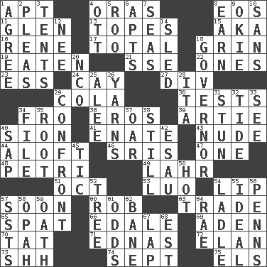 ACROSS 1. Fitting 4. Mouths or openings 8. Greek goddess of the dawn 11. Small, secluded valley 13. Drinks excessively 15. Alias (abbr.) 16. French philosopher Descartes 17. Add up to 18. Broad smile 19. Ingested 21. Compass dir. 22. Singles 23. Curvy letter 24. Island 27. HTML Container Element 29. Root beer relative 30. Trials 34. Back 36. Greek god of love 39. Nick name for Arthur 40. The Jewish people; Israel 41. Maternal 43. Naked 44. High up in or into the air 46. Indian titles of respect 47. Single 48. _ dish (used to culture cells) 49. Cowardly lion portrayer 51. Sep. follower 53. Nilotic language 54. Mouth edge 57. Within a short period 60. Director Reiner 63. Buy and sell 65. Petty quarrel 66. Peak District village in England 69. An important port of Yemen 70. Make lace 71. Ferber et al. 72. Flair 73. Quiet! 74. Back-to-school mo. 75. Raised railways DOWN 1. Match 2. Entreaties 3. Portable shelters 4. Baseball player Mel 5. Friend of Pooh 6. Tenement units (abbr.) 7. Oceans 8. Merit 9. Migrant worker of the '30s 10. Without 12. Born 14. Downhill vehicle 18. State head 20. Non-commissioned officer (abbr.) 25. Toward shelter 26. Tall tales 28. Call ___ day 29. Meet 31. Make senseless or dizzy 32. Periodic rise and fall of the sea level 33. Perceive with the eye 34. Do some clerical work 35. Carrot, for example 37. Boat paddle 38. Free of sound 40. Plant excrement 42. Son of Isaac 45. Nervous spasm 50. Being at a high temperature 52. Family _ (genealogy) 54. Dipping utensil 55. Perfect 56. Actor Sean's family 57. Fast planes 58. Brightly colored fish 59. Pledge 61. Likelihood 62. Object of repulsion 64. Actress Charlotte 67. Pet locale 68. Eastern Standard Time (abbr.)