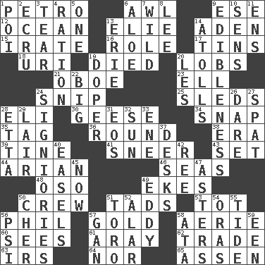 ACROSS 1. Stone: prefix 6. Leather borer 9. Compass dir. 12. Sea 13. Writer Wiesel 14. An important port of Yemen 15. Feeling or showing extreme anger 16. Hero or heavy, e.g. 17. Metal containers 18. RI univ. 19. Passed on 20. Tennis shots 21. Mitch Miller's instrument 23. Pipe bend 24. Sever or remove by pinching or nipping 25. Bobsleighs 28. Biblical high priest 30. Honkers 34. Fastener 35. Label 36. One shot 38. Period 39. Prong on a fork 41. Contemptuous expression 43. Arrange properly for use 44. Believer in; advocate of (suffix) 46. Oceans 48. Bear (Spanish) 49. Supplements with great effort 50. Ship's personnel 51. Small amounts or degrees 53. Small child 56. Silvers or Donahue 57. Gilt 58. Nest on high 60. Observes 61. Like ___ of sunshine 62. Swap 63. Big collection agency 64. Not either 65. NE Netherlands city DOWN 1. Luau course 2. Shade of tan 3. Rend 4. Food allowance for one day 5. Single 6. _ vera 7. Rampant 8. Area sheltered from the wind 9. The property of being fit to eat 10. Elected reps. 11. Followers of ems 13. 4th largest of the Great Lakes 14. Ringlike coral islands and reefs 19. Drug addict 20. French article 22. Large 24. Seigniories (variant) 26. Have the gumption 27. Argument over a trivial matter 28. Singer James 29. Den 31. Greek goddess of the dawn 32. Player for Phoenix 33. Compass dir. 37. Writing tables 40. Artist's stands 42. To riddle 45. At this time 47. Michaelmas daisies 49. Whirlpool 50. "Mermaids" star 51. "Corrida" creature 52. Having or resembling wings 54. Mouths or openings 55. Event that recurs at intervals 56. Air pressure measure (abbr.) 57. Separate the seeds from cotton 58. _ moment's notice (2 wds.) 59. Car or cant ending