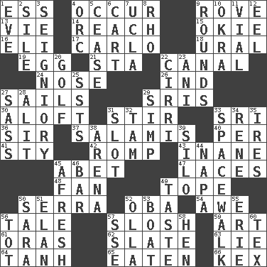 ACROSS 1. Curvy letter 4. Come to pass 9. Be footloose 13. Compete 14. Arrive at 15. Migrant worker of the '30s 16. Biblical high priest 17. Monte _, Las Vegas Hotel/Casino 18. Mountain range 19. Ovum 21. R.R. building 22. Lessep's creation 24. Sense of smell 26. Indiana (abbr.) 27. Moves on water 29. Indian titles of respect 30. Upward 31. Tumult 33. _ Lanka 36. Title for a knight 37. Deli grouping 40. For each 41. Filthy place 42. Play 43. Lacking in sense or substance 45. Collude with 47. Shoestrings 48. Air blower 49. Drink excessively 50. Spanish missionary in California 52. Chief or king in Benin or Nigeria 54. Deep reverence 56. Story 57. Make a splashing sound 59. Tate display 61. Mouths or openings 62. Chalkboard 63. Whopper 64. Hyperbolic tangent 65. Ingested 66. A weed DOWN 1. Night before a holiday 2. Drop; flow; fall 3. Signiory (variant) 4. The grampus (Milton) 5. Desist 6. Heavy open wagon 7. Southern CA. univ. 8. 17th letter of the Greek alphabet 9. Periods in a boxing match 10. Gumbo ingredient 11. Small bottle 12. Snakelike fish 20. Eighteen holes 22. High-altitude cloud 23. Black tropical American cuckoo 25. Fast planes 27. Backtalk 28. Set down 29. Simple or foolish person 31. Narrow opening 32. Scottish cap 33. High altitude stroll 34. French philosopher Descartes 35. Angers 38. Sports stadium 39. Grain storage tower 44. California wine valley 45. Anew 46. Tavern 49. Clothes sense 50. "Two Mules for Sister ____" 51. Enthusiasm 52. Spanish pot 53. Water vessel 55. One of the Great Lakes 56. Small child 57. Compass dir. 58. Layer 60. John Ritter's dad