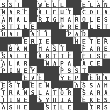 ACROSS 1. Fast jet (abbr.) 4. Not ill 8. Style 12. Female horse 14. Native American of Southwest Alaska 16. Root beer relative 17. Of or related to the anus 18. Frustrating wastes of time 20. Vertical member of a panel or frame 22. Before (prefix) 23. Allow 24. Actor Linden 25. Everything 28. Groovy apt. 30. 4th largest of the Great Lakes 31. Distance measurement 35. Forbid 37. Vertical spar for supporting sails 40. Conductor's collection 41. Table seasoning 42. Nick name for Arthur 44. Otherwise 45. Having or resembling wings 46. California wine valley 47. Adept person 48. Abounding in pines 50. Inconspicuous attention getter 52. Night before a holiday 54. Slangy assent 55. Epoch 58. Eastern Standard Time (abbr.) 61. Car or cant ending 63. Indian state 65. Interpreter 70. "Two Mules for Sister ____" 71. Prong on a fork 72. Damascus' land 73. Makes supply last 74. American tennis player Robert 75. Drop; flow; fall 76. Big collection agency DOWN 1. Box-office sellout 2. Before Barbara or Clara 3. Hang back 4. Armed conflict 5. Connecticut Ivy Leaguer 6. Part of a journey 7. Mass 8. Environmental prefix 9. Hang loosely or laxly 10. Toward shelter 11. Political cartoonist Thomas 13. Pipe bend 15. Canvas cover 19. 480, 500 or 516 sheets of paper 21. Hearing organ 26. Pale green bean 27. Memorize 29. Outscore 30. Main course 32. Baby powder 33. Celtic language 34. Portuguese money of account (variant) 35. Indonesian resort city 36. ____ Jay Lerner 38. R.R. building 39. Likely to tip or tilt 41. Plant excrement 43. Relaxation 49. Jacques Cousteau's middle name 51. Health resort 53. Snakelike fish 55. 1973 Nobel Price Winner (Physics) Leo 56. More uncommon 57. Collect or gather 58. Singer James 59. Indian titles of respect 60. Hyperbolic tangent 62. Negative votes 64. Compass dir. 66. Born 67. Three (prefix) 68. Petroleum 69. Actress Charlotte