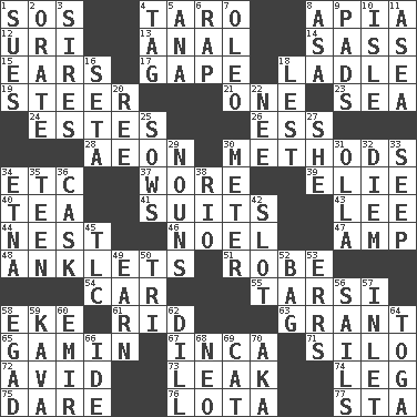ACROSS 1. Distress signal 4. Pacific island yam 8. Capital of Western Samoa 12. RI univ. 13. Of or related to the anus 14. Backtalk 15. Hearing organs 17. Open wide 18. Dipping utensil 19. Guide 21. Single 23. Ocean 24. _____ Park, CO 26. Curvy letter 28. A really long time 30. Modes 34. And so on (abbr.) 37. Had on 39. Writer Wiesel 40. Beverage made from leaves 41. Sets of matching outer garments 43. Area sheltered from the wind 44. Egg locale 46. Christmas carol 47. Electrical Unit 48. Short socks 51. Loose flowing garment 54. Automobile 55. Tarsus (plural) 58. Supplement with great effort 61. To free from 63. Let have 65. Street urchin 67. South American Indian 71. Grain storage tower 72. Enthusiastic 73. Path through which fluid escapes 74. Part of a journey 75. Have the gumption 76. Globular water bottle used in Asia 77. R.R. building DOWN 1. Takes to court 2. Declaim 3. Begets 4. Label 5. Santa ___, CA 6. Reproach for some lapse or misdeed 7. Margarine 8. White ___ sheet 9. Writing tablets 10. Capri or Wight 11. Toward the sea 16. Bristle 18. For fear that 20. To riddle 22. Born 25. Sty mamas 27. A female animal or person 29. Parts of speech 30. Distance measurement 31. Spanish pot 32. South Vietnam president (1954) 33. Ooze 34. Inactive volcano in Sicily 35. Adolescent 36. Keg 38. River (Sp.) 42. Notch 45. Affectionate concern, for short 49. Merit 50. Three (prefix) 52. Container for groceries 53. Blunders 56. Moves on water 57. An arm off of a larger body of water 58. Mild oath 59. Polynesian shrub of the pepper family 60. Arab leader 62. Deli pickle 64. Ancient Roman robe 66. Binary compound 68. Modern: prefix 69. Domesticated feline 70. Alias (abbr.)