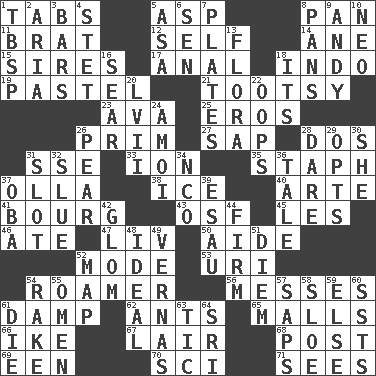 ACROSS 1. Bar bills 5. Cleo's killer 8. Baking dish 11. Naughty child 12. Automatic 14. One (Scot) 15. Fathers 17. Of or related to the anus 18. _ china 19. Soft color 21. Tootsie (variant) 23. Actress Gardner 25. Greek god of love 26. Demure 27. Plant excrement 28. Two (Sp.) 31. Compass dir. 33. Electrically charged atom 35. Staphylococcus 37. Water jar 38. Frozen water 40. Johnson of "Laugh-In" 41. Town 43. Order of Saint Francis (abbr.) 45. French article 46. Had dinner 47. 54 in ancient Rome 50. Helper 52. Method 53. RI univ. 54. Wanderer 56. Makes clutter 61. Moist 62. Pismires 65. Shopping centers 66. Eisenhower's nickname 67. Den 68. Mail 69. Car or cant ending 70. _-fi 71. Perceives with the eye DOWN 1. Cook's measure (abbr.) 2. Operatic vocal solo 3. Long, evenly shaped pieces 4. Proofreading order 5. White ___ sheet 6. Elected rep. 7. Food holders 8. Baking dishes 9. Actor Griffith 10. Modern: prefix 13. Plants 16. Singe 18. It is 20. 57 in ancient Rome 22. I made a mistake 24. Mine, in Marseilles 26. Lightbulb-shaped fruit 28. Have the gumption 29. Chooses 30. A female animal or person 31. Groove 32. Turn sharply 34. Non-commissioned officer (abbr.) 36. Falsehood 37. Chief or king in Benin or Nigeria 39. He sold his birthright 42. Take by theft 44. Become taut 48. Standard of perfection 49. Actresses Bloom and Felton 51. South Vietnam president (1954) 52. Atlas unit 54. Immoral or dissolute person 55. Presage 57. Plant excrements 58. _ gin 59. Otherwise 60. Fast planes 61. Pass on 63. Nervous spasm 64. Indian title of respect (Mr.)