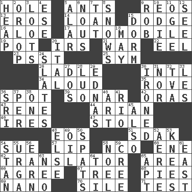 ACROSS 1. Hollow 5. Pismires 9. Vintage cars 13. Greek god of love 14. Grant temporary use of 15. Evade 16. _ vera 17. Form of transportation 19. Cooking vessel 20. Big collection agency 21. Armed conflict 22. Snakelike fish 23. Inconspicuous attention getter 25. Symbol (abbr.) 26. Dipping utensil 30. International (abbr.) 34. Verbally 35. Be footloose 36. Specific locale 39. Underwater navigation system 42. Mouths or openings 43. French philosopher Descartes 44. Believer in; advocate of (suffix) 46. Angers 47. Took without asking 48. Greek goddess of the dawn 51. Neighbor of Neb. 54. Institute legal proceedings 57. Mouth edge 58. Non-commissioned officer (abbr.) 60. Compass dir. 62. Interpreter 65. Type of rug 66. Match 67. Family _ (genealogy) 68. Sliced desserts 69. Billionth: prefix 70. Filth; sediment 71. Trial DOWN 1. Pile 2. Lowest deck of a ship 3. Plunders 4. Compass dir. 5. Having or resembling wings 6. Good sense 7. Make lace 8. Frozen precipitation (plural) 9. Director Reiner 10. Singer Brickell 11. Stare at amorously 12. Sew up the eyelids of hawks and falcons 15. Dormintory (informal) 18. Fifth month 20. Slanted text style (abbr.) 24. Chalkboards 27. Two (Sp.) 28. Nilotic language 29. Ferber et al. 30. Pressed 31. And not 32. Federal power corp. 33. French article 36. Indian title of respect (Mr.) 37. For each 38. Single 40. Nonscientific branch of learning 41. River (Sp.) 45. In addition 48. Otherwise 49. Lubricate 50. Arguments over trivial matters 52. Nest on high 53. Leg joints 54. Comedian Laurel of Laurel & Hardy 55. Capital and largest city of Mongolia 56. Merit 58. Christmas carol 59. Algonquian 61. 90 degrees 63. Modern: prefix 64. Three (prefix) 65. Fitting