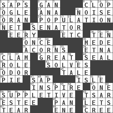 ACROSS 1. Plant excrements 5. Separate the seeds from cotton 8. Hoof sound 12. Stare at amorously 13. Santa ___, CA 14. Annoying sound 15. Northwest Algerian city 16. Census information 19. Remaining after all deductions 20. Legislator 21. Suggestive of the supernatural 23. And so on (abbr.) 24. Nine, plus one 27. At one time in the past 30. Ancient Persian 31. Oak nuts 34. Inactive volcano in Sicily 35. Burrowing marine mollusk 38. Relatively large 40. Lick closed 41. Hero or heavy, e.g. 42. Finds the solution 44. Aroma 45. Lie 46. Sliced dessert 47. Plant excrement 50. Small island 53. Heighten or intensify 57. Single 59. Supplying deficiencies 63. Russian ruler of old 64. First name in cosmetics 65. Baking dish 66. Allows 67. Lacerate 68. Compass dir. 69. Algonquian DOWN 1. Within a short period 2. Match 3. Food holder 4. Elected rep. 5. Stare wonderingly 6. Soon (poet.) 7. California wine valley 8. Small bed 9. Cards in a Roman deck? 10. Bear (Spanish) 11. Fenced enclosure 14. Drug cop 17. Shoshoni 18. Car dealer's back yard 20. Synchronize (abbr.) 22. Wanderer 24. Wig 25. Pulitzer Prize-winning author Ferber 26. Anneal 28. Gear tooth 29. Blunders 30. Makes clutter 32. Modern: prefix 33. Table seasoning 35. Riding implement 36. Farming town in central California 37. Medicinal plant 39. Federal power corp. 43. Writer Wiesel 47. Filth; sediment 48. One (Scot) 49. Pacific Standard Time (abbr.) 51. Failure 52. Maternal 54. Corncob 55. "Terrible" tsar 56. French philosopher Descartes 58. Celtic language 59. Arrange properly for use 60. Purpose 61. Parent Teacher Association (abbr.) 62. For each 63. Affectionate concern, for short
