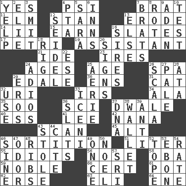 ACROSS 1. It is so 4. 23rd letter of the Greek alphabet 7. Naughty child 11. Shade tree 12. Comedian Laurel of Laurel & Hardy 13. Eat (away) 14. Cards in a Roman deck? 15. Merit 16. Chalkboards 17. _ dish (used to culture cells) 19. Aide 21. Binary compound 23. Angers 24. Ripens 25. Mature 26. Health resort 29. Peak District village in England 30. Followers of ems 31. Feline 32. RI univ. 33. Big collection agency 34. According to 35. "Barney Miller" actor Jack 36. _-fi 37. A sleeping potion; an opiate (poet.) 40. Double-curved letter 41. Area sheltered from the wind 42. Grandmother 43. Examine hastily 45. The first octave above the treble staff 46. Decision 51. 61 cubic inches 55. Foolish or stupid persons 56. Characteristic smell of wine 58. Chief or king in Benin or Nigeria 59. Impressive in appearance 60. An absolute certainty 61. Plant holder 62. Celtic language 63. Connecticut Ivy Leaguer 64. Compass dir. DOWN 1. Sharp bark 2. Writer Wiesel 3. Stricken, poetically 4. Parent Teacher Assoc. 5. "Two Mules for Sister ____" 6. Lodging establishments 7. Naughty children 8. Round or rotation of duties 9. Arabian gulf 10. Trial 12. Beer mug 13. Otherwise 16. Fathers 18. Capital of Latvia 20. Signals 22. Compass dir. 24. Goodbye (Sp.) 25. Nest on high 26. Any of the three canals of the cochlea 27. Light colored 28. "One Day ___ Time" 29. Greek god of love 32. Purpose 33. Ancient Celtic tribe of eastern Britain 36. Narrow boards 37. Heredity factor (abbr.) 38. Place for singles 39. Against 43. Fur scarf 44. Quote 46. Trig term 47. Aroma 48. Teases 49. Single time 50. Christmas carol 52. Drink excessively 53. Inky black, to poets 54. Pace 57. _ Lanka