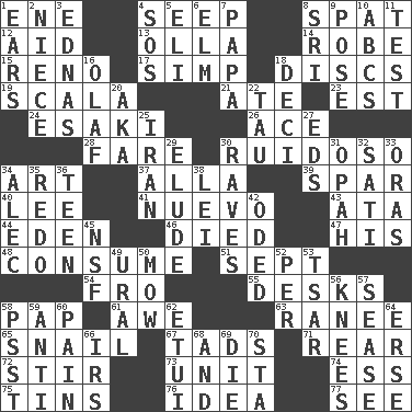 ACROSS 1. Compass dir. 4. Ooze 8. Argument over a trivial matter 12. Help 13. Spanish pot 14. Loose flowing garment 15. Western Nevada city 17. Simple or foolish person 18. Plates 19. Any of the three canals of the cochlea 21. Had dinner 23. Eastern Standard Time (abbr.) 24. 1973 Nobel Price Winner (Physics) Leo 26. Adept person 28. Conductor's collection 30. Noisy, rowdy, vocal (Spanish) 34. Nonscientific branch of learning 37. Silent film actress Nazimova 39. Practice fight 40. Area sheltered from the wind 41. New (sp.) 43. "One Day ___ Time" 44. Paradise 46. Passed on 47. Part of HMS, perhaps 48. Ingest 51. Back-to-school mo. 54. Back 55. Writing tables 58. Infant food 61. Deep reverence 63. Indian princess (variant) 65. Slow-paced one 67. Small boys 71. Hitchcock's "____ Window" 72. Tumult 73. A single undivided whole 74. Curvy letter 75. Metal containers 76. The content of cognition 77. Perceive with the eye DOWN 1. Hearing organs 2. Sibling's daughter 3. Ferber et al. 4. Mayday 5. Biblical high priest 6. Shade tree 7. Dad 8. _ Lanka 9. Introduce or present, as a question 10. Lettered men learn these first 11. Trial 16. Norwegian king 18. Tenth: prefix 20. Alias (abbr.) 22. The 19th letter of the Greek alphabet 25. SW Asia republic 27. Begley and Asner 29. Dodge 30. All-night dance parties 31. Brightly colored fish 32. Suttee (variant) 33. Mouths or openings 34. Actor Baldwin 35. Redecorate 36. Adolescent 38. Luau accessory 42. Wrote a lyric poem 45. Science/research agcy. 49. Mountain range 50. Cut the grass 52. For each 53. Russian ruler of old 56. Leg joints 57. Gospel singer Marvin 58. Inconspicuous attention getter 59. Opposed to 60. Ache 62. Needle holder 64. Celtic language 66. Big collection agency 68. Plus 69. Pass on 70. R.R. building