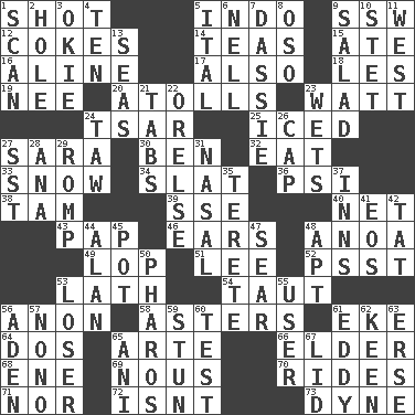 ACROSS 1. Attempt 5. _ china 9. Compass dir. 12. Popular sodas 14. Afternoon social gatherings 15. Had dinner 16. Place in a line 17. In addition 18. French article 19. Born 20. Ringlike coral islands and reefs 23. Electrical Unit 24. Russian ruler of old 25. On the rocks 27. "Two Mules for Sister ____" 30. Benjamin's nick name 32. Ingest 33. Overwhelm 34. Narrow board 36. Air pressure measure (abbr.) 38. Scottish cap 39. Compass dir. 40. Remaining after all deductions 43. Infant food 46. Hearing organs 48. Small Philippine buffalo 49. Chop off 51. Area sheltered from the wind 52. Inconspicuous attention getter 53. Thin strip of wood or metal 54. Tense 56. Soon (poet.) 58. Michaelmas daisies 61. Make supply last 64. Two (Sp.) 65. Johnson of "Laugh-In" 66. A person who is older than you are 68. Compass dir. 69. Common sense 70. Amusement-park features 71. And not 72. Is not 73. Unit of force DOWN 1. Skim 2. Opening into or through something 3. Migrant worker of the '30s 4. Nine, plus one 5. Slanted text style (abbr.) 6. 1994 drama film starring Jodie Foster 7. Small ungulate mammals of Africa 8. Bear (Spanish) 9. First course 10. Proofreading order 11. 270 degrees 13. Oceans 21. Bar bills 22. Threatening words 23. Moistens 24. The 23rd letter of the Hebrew alphabet 26. Head covering 27. Fast jet (abbr.) 28. Santa ___, CA 29. Play 31. Rhinal 35. Cylindrical with tapered ends 37. Lodging establishments 41. Greek goddess of the dawn 42. Make lace 44. ____ Jay Lerner 45. Cooking vessel 47. Shrivel 48. Fitting 50. N Egypt peninsula 53. Failure 55. One who makes use of a thing 56. An important port of Yemen 57. Words to Nanette 59. Astound 60. Trial 61. Whirlpool 62. Peachy ____! 63. Celtic language 65. Black tropical American cuckoo 67. Hat (slang)