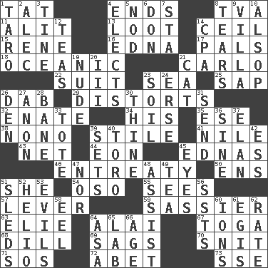 ACROSS 1. Make lace 4. Extremities 8. Federal power corp. 11. Came down and settled, as after flight 13. Plunder 14. To provide with a ceiling 15. French philosopher Descartes 16. Pulitzer Prize-winning author Ferber 17. Friends 18. Pertaining to the sea 21. Monte _, Las Vegas Hotel/Casino 22. Costume for a special activity 23. Ocean 25. Plant excrement 26. Small moist lump or mass 29. What propaganda does 32. Maternal 34. Part of HMS, perhaps 35. Compass dir. 38. Words to Nanette 39. Vertical member of a panel or frame 41. "Death on the ____" 43. Fish or hair follower 44. Period of immesurable duration 45. Ferber et al. 46. Plea 50. Followers of ems 51. A female animal or person 54. Bear (Spanish) 55. Observes 57. Prying instrument 59. More lively and spirited 63. Writer Wiesel 64. Jai _ 67. Ancient Roman robe 68. Deli pickle 69. Sinks 70. In a ____ (agitated or irritated) 71. Distress signal 72. Collude with 73. Compass dir. DOWN 1. Pacific island yam 2. Actor Baldwin 3. Prong on a fork 4. Chooses 5. Allow head to fall sleepily 6. Spanish title 7. R.R. building 8. Pulls apart 9. Country estate 10. Columnist Joseph or Stewart 12. Beverages made from leaves 14. Tax preparer (abbr.) 19. Naked 20. One more than two 21. Feline 23. Land 24. Celtic language 26. Lair 27. Soon (poet.) 28. Object of repulsion 30. One or ones belonging to thee 31. Post 33. Carryall 36. Trig term 37. Enthusiasm 39. Arranges properly for use 40. "Corrida" creature 42. Curvy letter 45. Snake ____ (dice throw) 47. And not 48. Aid 49. Beverage made from leaves 51. Bobsleighs 52. Sun: prefix 53. Vices 56. Fast planes 58. Snakelike fish 60. Charged atoms 61. Armor plate that protects the chest 62. Pace 64. White ___ sheet 65. Experiment locale 66. Personal question