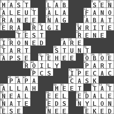 ACROSS 1. Vertical spar for supporting sails 5. Experiment locale 8. Elected rep. 11. Native American of Southwest Alaska 13. Wing 14. Papal veil 15. Indian princess (variant) 16. Tired old horse 17. Blind as ____ 18. Epoch 19. Swiss mountan, "Queen of the Mountains" 21. Compose 22. Trial 24. French philosopher Descartes 25. Pressed 27. "We ___ not amused" (Victoria) 29. Small pie 30. Difficult or unusual or dangerous feat 32. Domed church section 33. Giggle 35. Mitch Miller's instrument 39. Agitated, as a liquid 41. Component 42. Personal Computers (abbr.) 43. Medicinal drug used to evoke vomiting 45. Dad 48. Keg 49. Assad's deity 50. Rendezvous 52. Make lace 55. Be tempered by heat 56. Snakelike fish 57. Peak District village in England 59. Nathan's nickname 60. Begley and Asner 61. High-strength synthetic material 62. Compass dir. 63. Born 64. Made supply last DOWN 1. Female horse 2. Having or resembling wings 3. Legislators 4. Third day of the wk. 5. Austrian-born American filmmaker Fritz 6. Jai _ 7. Container for groceries 8. Unit of acoustic absorption 9. Related on the mother's side 10. Short letter 12. Laconic 14. Conductor's collection 20. It would 21. Songbird 23. Keyboard key 25. Call ___ day 26. Reproach for some lapse or misdeed 27. Had dinner 28. Regret 30. Like a shrinking violet 31. Drinks excessively 33. Nervous spasm 34. Raised railways 36. Sass 37. Mouth or opening 38. And so on (abbr.) 40. Brightly colored fish 43. Frozen water 44. Eucharist need 45. Entreaties 46. Having winglike extensions 47. Diluted with white 49. Queen of England 1702-14 50. Ancient Persian 51. Otherwise 53. Medicinal plant 54. Be inclined (to) 56. Car or cant ending 58. Color