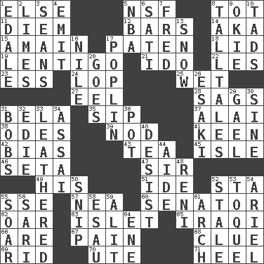 ACROSS 1. Otherwise 5. Overdraft (abbr.) 8. Small child 11. South Vietnam president (1954) 12. Soap units 14. Alias (abbr.) 15. With great haste 17. Eucharist need 18. Hat (slang) 19. Small, flat, pigmented spot on the skin 21. Wedding promise 22. French article 23. Curvy letter 24. Chop off 25. Dripping 27. Snakelike fish 28. Sinks 31. Actor Lugosi 35. Small drink 37. Jai _ 38. Lyric poems 39. Allow head to fall sleepily 41. Peachy ____! 42. Prejudice 43. Beverage made from leaves 45. Capri or Wight 46. Bristle 47. Title for a knight 49. Part of HMS, perhaps 51. Binary compound 52. R.R. building 55. Compass dir. 57. Teachers' org. 60. Legislator 62. Rowing implement 63. Small island 65. Resident of Iraq 66. "We ___ not amused" (Victoria) 67. Ache 68. A slight indication 69. To free from 70. Shoshoni 71. Person who is morally reprehensible DOWN 1. Peak District village in England 2. Citrus fruits 3. Seines 4. Give off 5. Basketball assoc. 6. Suttee (variant) 7. Flintstone 8. Baron Munchausen's specialties 9. Migrant worker of the '30s 10. Bits 13. Frozen precipitation 16. "Death on the ____" 17. Cotton for raincoats, e.g. 20. Leaves 26. 1973 Nobel Price Winner (Physics) Leo 29. Highlander 30. Trig term 31. Moves up and down 32. Singer Brickell 33. Resembling or made to resemble leather 34. Slender Brazilian palm 36. Plant holder 40. Stop 44. Assistant 48. Painter Guido (1575-1642) 50. Clip 52. Showing deterioration from age 53. Woman's close-fitting hat 54. Satellite of Uranus 55. Fly high 56. Indian skirt 58. He sold his birthright 59. Set down 61. Bowlike part 64. Compass dir.
