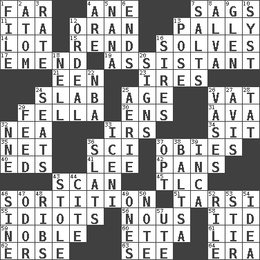 ACROSS 1. Distant 4. A saturated hydrocarbon 7. Settles 11. Call ___ day 12. NW Algerian seaport 13. Chummy 14. Car dealer's back yard 15. Tear apart 16. Finds the solution 17. Make improvements or corrections to 19. Aide 21. Car or cant ending 23. Angers 24. Broad, flat, thick piece 25. Mature 26. Large container 29. Chap (slang) 30. Followers of ems 31. Actress Gardner 32. Teachers' org. 33. Big collection agency 34. Be seated 35. Remaining after all deductions 36. _-fi 37. Off-Broadway awards 40. Begley and Asner 41. Area sheltered from the wind 42. Baking dishes 43. Glance over 45. Affectionate concern, for short 46. Decision 51. Tarsus (plural) 55. Foolish or stupid persons 56. Good sense 58. It would 59. Having high moral qualities 60. Singer James 61. Falsehood 62. Celtic language 63. Perceive with the eye 64. Epoch DOWN 1. Do some clerical work 2. Smallest unit of an element 3. Assign a rank or rating to 4. "We ___ not amused" (Victoria) 5. Grandmother 6. Conclusions 7. Table seasonings 8. Inventor's middle name 9. Small, secluded valley 10. System (abbr.) 12. Severe or trying experience 13. Airs 16. Fathers 18. 1994 drama film starring Jodie Foster 20. Omens 22. Basketball assoc. 24. Theater features 25. Nest on high 26. Flower holders 27. Deliberation 28. Make lace 29. Nourish 32. Compass dir. 33. Ancient Celtic tribe of eastern Britain 36. Narrow boards 37. Elect 38. Greek mezzo-soprano Agnes 39. South American Indian 43. Took without asking 44. Quote 46. Trig term 47. Scent 48. Chest bones 49. Singles 50. Observe 52. Cause heat under the collar 53. Disorderly outburst 54. The main thing one is thinking about 57. Shoshoni
