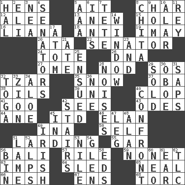 ACROSS 1. Coop moms 5. Small island 8. Burn to charcoal 12. Toward shelter 13. Afresh 15. Hollow 16. Woody, climbing, usually tropical plant 18. Opposed to 19. "If ____ say so..." 20. _ moment's notice (2 wds.) 22. Elected representative 24. Lug 26. Heredity factor (abbr.) 27. Sign of things to come 28. Dreamland 29. Distress signal 32. Czar 35. Overwhelm 37. Chief or king in Benin or Nigeria 38. Lubricates 39. Single; one (prefix) 40. Hoof sound 41. Thick or sticky substance 42. Observes 43. Lyric poems 44. A saturated hydrocarbon 45. It would 46. Enthusiasm 49. _ tizzy (2 wds.) 50. Oneself 51. Preparing or cooking with lard 55. Slender fish 56. Indonesian resort city 57. Cause heat under the collar 59. Music written for nine 63. Naughty children 64. Downhill vehicle 65. Anneal 66. Soft 67. Followers of ems 68. Torque (variant) DOWN 1. Actor Linden 2. Biblical high priest 3. Teachers' org. 4. Elected representatives 5. American Automobile Association (abbr.) 6. Taverns 7. False hair 8. Riviera of "Kiss of the Spider Woman" 9. Same (prefix) 10. Having or resembling wings 11. Marina Del _, California 14. Light entry point 17. Smallest unit of an element 21. Had dinner 23. Also 25. Followed as a consequence or result 28. Annoying sounds 29. Disposed of to a purchaser 30. Mitch Miller's instrument 31. Plant excrements 32. Ancient Roman robe 33. The Jewish people; Israel 34. Medicinal plant 36. Compass dir. 40. Meet 42. Flight of steps 45. Indiana (abbr.) 47. Part of a journey 48. Actor Alda or Thicke 49. From or relating to Ireland 51. Unable to walk 52. High mountains 53. Mediterranean tributary 54. Small, secluded valley 56. Storage container 58. Begley and Asner 60. Modern: prefix 61. Hearing organ 62. Affectionate concern, for short