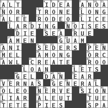 ACROSS 1. Keyboard modifier key 4. The main thing one is thinking about 8. Small Philippine buffalo 12. And not 13. Heavy duty weighing machine 14. Protracted 15. Toward shelter 17. Cowboy competition 18. Louse (plural) 19. Preparing or cooking with lard 21. Annoying sounds 23. Pass on 24. Ocean 26. Sorrow 27. So be it 28. Island territory of the United States 30. Cuckoo 31. Spring feasts 34. Writing instrument 37. Cartoonist voice _ Blanc 38. Amid 39. The grampus (Milton) 40. Leather borer 41. Cause to be 42. Friend of Pooh 43. Grant temporary use of 44. Allows 46. Set 47. One of the 12 tribes of Israel 50. Ewer handle 51. Actresses Bloom and Felton 54. Commissioned military rank 57. Margarine 58. Boldness 60. The Jewish people; Israel 62. One who doesn't tell the truth 63. Native American of Southwest Alaska 64. Third day of the wk. 65. False hair 66. Sliced desserts 67. Health resort DOWN 1. Santa ___, CA 2. Hang loosely or laxly 3. Excercise machine 4. Metal shackles 5. Evade 6. Compass dir. 7. A really long time 8. Plant genus of onion and garlic 9. Annoying sound 10. Single time 11. Ripens 13. Three (prefix) 16. One of the Great Lakes 20. Lair 22. Mouths or openings 25. Representative 27. Afresh 29. Goad 30. Nanny (var.) 31. "Two Mules for Sister ____" 32. Make improvements or corrections to 33. ___ good deed 34. Likenesses of persons 35. Greek god of love 36. Non-commissioned officer (abbr.) 41. Root beer relative 43. Poe poem 44. Area sheltered from the wind 45. Hearing organs 46. Relatively large 48. Match 49. Congenital growth or mark on the skin 51. Electrical Unit 52. Writer Wiesel 53. Fastener 55. Remaining after all deductions 56. Central Nebraska county 59. Connecticut Ivy Leaguer 61. Teachers' org.