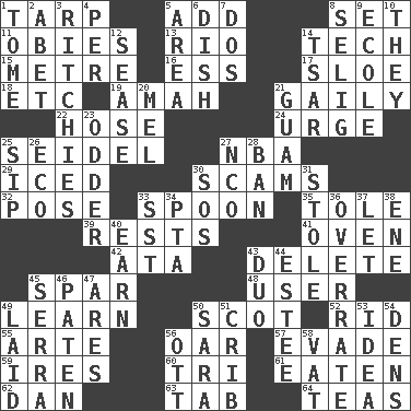 ACROSS 1. Canvas cover 5. Say or write further 8. Put into a specified state 11. Off-Broadway awards 13. River (Sp.) 14. Technical 15. Distance measurement (Brit.) 16. Double-curved letter 17. A type of plum 18. And so on (abbr.) 19. Housemaid 21. Lightheartedly 22. Stockings 24. Goad 25. A glass for beer 27. Basketball assoc. 29. On the rocks 30. Fraudulent business schemes 32. Airs 33. Soup utensil 35. Lacquered or enameled metalware 39. Musical pauses 41. Baking chamber 42. "One Day ___ Time" 43. Keyboard key 45. Coast Guard woman 48. One who makes use of a thing 49. Acquire or gain knowledge or skills 50. Native of Scotland 52. To free from 55. Johnson of "Laugh-In" 56. Boat paddle 57. Dodge 59. Angers 60. Three (prefix) 61. Eroded 62. Daniel's nick name 63. Keyboard key 64. Beverages made from leaves DOWN 1. Heavy book 2. Collude with 3. Actors Guy, Robert Welles, and Clint 4. For each 5. Type of rug 6. Food container 7. Two (Sp.) 8. Major League Baseball Commissioner Bud 9. Learning spot: Fr. 10. Those people 12. Gospel singer Marvin 14. Russian ruler of old 20. Cartoonist voice _ Blanc 21. Island territory of the United States 23. More peculiar 25. Small drink 26. Environmental prefix 27. Non-commissioned officer (abbr.) 28. Forbid 30. Mayday 31. Fur scarf 33. Fast jet (abbr.) 34. Parent Teacher Assoc. 36. Make much ado about nothing 37. Allow 38. Compass dir. 40. Merit 43. Superhero pair 44. First name in cosmetics 45. Father Junipero _ 46. Eucharist need 47. Ancient Greek god of war 49. Put down 50. "Two Mules for Sister ____" 51. Baby bed with high sides 53. The content of cognition 54. Hiding places for outlaws 56. Baseball player Mel 58. Large container