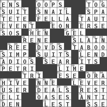 ACROSS 1. Followers of ems 4. I made a mistake 8. Coat; cloak 11. Costume for a special activity 13. Slow-paced one 15. Health resort 16. False hair 17. Chap (slang) 18. Strained 19. Happening 21. Period of immesurable duration 22. Celtic language 23. Mayday 24. Layer 27. Set 29. French philosopher Descartes 30. Killed 34. To separate or throw off 36. Movie discs 39. Off limits 40. Simple or foolish person 41. Sets of matching outer garments 43. Grant temporary use of 44. Goodbye (Sp.) 46. Shrivel 47. It is 48. _ dish (used to culture cells) 49. Citrus frut 51. Three (prefix) 53. Compass dir. 54. Mouth or opening 57. Hub of activity 60. Compass dir. 63. Prying instrument 65. One who makes use of a thing 66. Allots cards 69. Relief 70. Connecticut Ivy Leaguer 71. Fertile tracts in a desert 72. Opposed to 73. Lair 74. For fear that 75. Compass dir. DOWN 1. _____ Park, CO 2. New (sp.) 3. Settings 4. Order of Saint Francis (abbr.) 5. Single 6. Light colored 7. Grain storage tower 8. Russian ruler of old 9. Musical composition 10. Yard entry 12. "___ Little Indians" 14. Long (Scottish) 18. Copy Pinocchio 20. Definite Article 25. Conclusions 26. Mole, birthmark 28. Eastern Standard Time (abbr.) 29. News announcer 31. Collude with 32. Charged atoms 33. Allow head to fall sleepily 34. Travel on an animal 35. Send forth 37. Pass on 38. Having lost freshness 40. Plant excrement 42. Indian titles of respect 45. Title for a knight 50. Cartoonist voice _ Blanc 52. _ china 54. Baking chambers 55. Musical pauses 56. Nick name for Arthur 57. Became colored 58. Capri or Wight 59. Distinctive style or manner 61. Be tempered by heat 62. Comfort 64. Epoch 67. French article 68. Fast jet (abbr.)