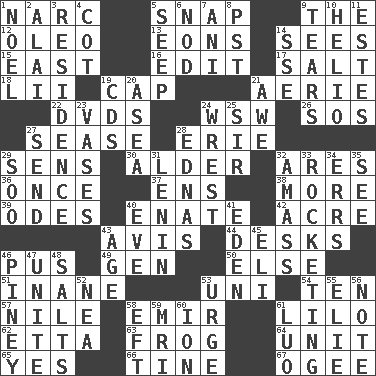 ACROSS 1. Drug cop 5. Fastener 9. Definite Article 12. Butter sub 13. Immeasurably long periods of time 14. Perceives with the eye 15. Compass direction 16. Prepare for publication 17. Table seasoning 18. Cards in a Roman deck? 19. Head covering 21. Nest on high 22. Movie discs 24. Compass dir. 26. Mayday 27. Gospel singer Marvin 28. 4th largest of the Great Lakes 29. Elected reps. 30. Tree or shrub in the Birch family 32. Ancient Greek god of war 36. At one time in the past 37. Followers of ems 38. Greater amount 39. Lyric poems 40. Related on the mother's side 42. Measure of real estate 43. Advice 44. Writing tables 46. Product of festering 49. Commissioned military rank (abbr.) 50. Otherwise 51. Lacking in sense or substance 53. University (slang) 54. "___ Little Indians" 57. Mediterranean tributary 58. Independent ruler or chieftain 61. _ and Stitch 62. Singer James 63. Tree-dwelling hopper 64. A single undivided whole 65. It is so 66. Prong on a fork 67. Double curve, resembling the letter S DOWN 1. Christmas carol 2. Jai ____ 3. Dwelling 4. Small bed 5. Ooze 6. Allow head to fall sleepily 7. Cuckoo 8. Pacific Standard Time (abbr.) 9. Rends 10. Sun: prefix 11. _____ Park, CO 14. Compass dir. 19. Music discs 20. Toward the sea 21. Deep reverence 23. Flower holders 24. Take or capture by force 25. Title for a knight 27. Transmit 28. Ferber et al. 29. "Barney Miller" actor Jack 31. Soviet premier 1918-24 32. Collect or gather 33. Shooting up abruptly 34. Blunders 35. Perceive with the eye 40. Night before a holiday 41. Paradise 43. Grow older 45. Connecticut Ivy Leaguer 46. Abounding in pines 47. Join together 48. Table seasonings 52. Teachers' org. 53. Goad 55. Writer Wiesel 56. Musical sound 58. Newt 59. Medical imaging device (abbr.) 60. Electrically charged atom 61. Nilotic language