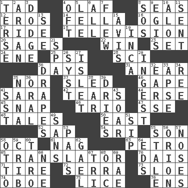 ACROSS 1. Small boy 4. Norwegian king 8. Oceans 12. Greek god of love 14. Man or boy (slang) 16. Stare at amorously 17. Travel on an animal 18. Boob tube 20. Gurus 22. Victory 23. Arrange properly for use 24. Compass dir. 25. 23rd letter of the Greek alphabet 28. _-fi 30. 24-hour periods 31. Approach 35. Not either 37. Downhill vehicle 40. Yawn 41. "Two Mules for Sister ____" 42. Lacerates 44. Celtic language 45. Fastener 46. Musical group of three 47. Compass dir. 48. Falsehoods 50. Compass direction 52. Plant excrement 54. _ Lanka 55. Manchild 58. Sep. follower 61. Tired old horse 63. Stone: prefix 65. Interpreter 70. Raised platform 71. Hoop that covers a wheel 72. Father Junipero _ 73. _ gin 74. Mitch Miller's instrument 75. Louse (plural) 76. Followers of ems DOWN 1. Laconic 2. Believer in; advocate of (suffix) 3. Evade 4. Often (poetically) 5. Area sheltered from the wind 6. Everything 7. Soared 8. Distress signal 9. Armor plate that protects the chest 10. _ vera 11. Posted 13. Observe 15. Opinion 19. South American Indian 21. Health resort 26. System (abbr.) 27. Small island 29. Swallow 30. Window treatments 32. Hearing organs 33. Domed church section 34. To riddle 35. Grandmother 36. Of the mouth 38. Ewer handle 39. Frees from moisture 41. Fast jet (abbr.) 43. Fly high 49. Without 51. Small drink 53. Friends 55. Having lost freshness 56. Greek mythologigal hunter 57. Olfactory organs 58. Von Bismarck 59. Baby bed with high sides 60. Edible starchy tuberous root 62. Highlander 64. Begley and Asner 66. Born 67. Three (prefix) 68. The grampus (Milton) 69. Actress Charlotte