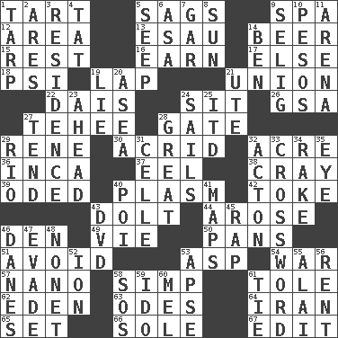 ACROSS 1. Small pie 5. Droops 9. Health resort 12. Length times width 13. He sold his birthright 14. Fermented drink made from hops 15. Relief 16. Merit 17. Otherwise 18. Air pressure measure (abbr.) 19. Pet locale 21. The state of being joined or united 22. Raised platform 24. Be seated 26. Girls' org. (abbr.) 27. Giggle 28. Yard entry 29. French philosopher Descartes 30. Bitter 32. Land measure 36. South American Indian 37. Snakelike fish 38. Supercomputer manufacturer 39. Wrote a lyric poem 40. Suffix with ecto or cyto 42. Puff or smoke 43. Stupid person 44. Came up 46. Lair 49. Compete 50. Baking dishes 51. Stay clear from 53. Cleo's killer 54. Armed conflict 57. Billionth: prefix 58. Simple or foolish person 61. Lacquered or enameled metalware 62. Locale of original sin 63. Lyric poems 64. SW Asia republic 65. Arrange properly for use 66. Not divided or shared with others 67. Prepare for publication DOWN 1. Canvas cover 2. Ancient Greek god of war 3. Dwelling 4. Make lace 5. Ooze 6. White ___ sheet 7. Slender fish 8. Player for Phoenix 9. Major League Baseball Commissioner Bud 10. Mexican monetary units 11. Sports stadium 14. Benjamin's nick name 19. Whopper 20. Toward the sea 21. Shoshoni 23. At or in the front 24. Moves on water 25. It would 27. Watch over 28. Relatively large 29. River (Sp.) 31. Cell (Danish) 32. 13-14th century defensive garment 33. What you're doing now 34. Libertine 35. Sight organ 40. Luau course 41. Atlas contents 43. Movie disc 45. Reproach for some lapse or misdeed 46. Natives or inhabitants of Denmark 47. Elude 48. Music written for nine 52. Electrically charged atom 53. Domed church section 55. Mountain range southwest of Kyrgyzstan 56. Monthly bill 58. Mayday 59. Wedding promise 60. Cartoonist voice _ Blanc 61. Make a knot