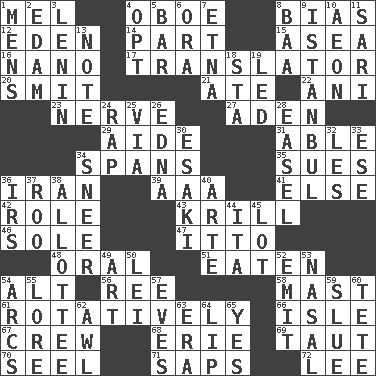ACROSS 1. Cartoonist voice _ Blanc 4. Mitch Miller's instrument 8. Prejudice 12. Paradise 14. Role in a play 15. Toward the sea 16. Billionth: prefix 17. Interpreter 20. Stricken, poetically 21. Had dinner 22. Black tropical American cuckoo 23. Boldness 27. Arabian gulf 29. Assistant 31. Competent 34. Connects, as a bridge 35. Takes to court 36. SW Asia republic 39. American Automobile Association (abbr.) 41. Otherwise 42. Hero or heavy, e.g. 43. The principal food of baleen whales 46. Flatfish 47. "Tell ____ the Marines!" 48. Spoken 51. Ingested 54. The first octave above the treble staff 56. Portuguese money of account (variant) 58. Vertical spar for supporting sails 61. Happening in regular succession 66. Small island 67. Ship's personnel 68. 4th largest of the Great Lakes 69. Strained 70. Stitch closed the eyes of (a falcon) 71. Plant excrements 72. Area sheltered from the wind DOWN 1. Not women's 2. Dutch treat 3. Soviet premier 1918-24 4. Elect 5. Oblong piece of solid material 6. Mouth or opening 7. Inactive volcano in Sicily 8. Sound made by sheep 9. Byzantium, centuries later 10. Period of immesurable duration 11. Indian skirt 13. Brief written record 18. R.R. building 19. Directed 24. Reproach for some lapse or misdeed 25. By way of 26. Pulitzer Prize-winning author Ferber 28. Artist's stand 30. 1973 Nobel Price Winner (Physics) Leo 32. French article 33. Compass dir. 34. Scornful expression 36. Big collection agency 37. Friend of Pooh 38. One to whom something is allotted 40. Johnson of "Laugh-In" 44. Call ___ day 45. Car dealer's back yard 49. Tate display 50. Luau accessory 52. Send forth 53. Relating to the nose 54. Curves 55. Old wives' tales, e.g. 57. Nights before holidays 59. Turn sharply 60. Wig 62. Leather borer 63. Period 64. Mouth edge 65. Consenting reply