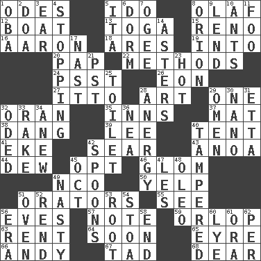 ACROSS 1. Lyric poems 5. Wedding promise 8. Norwegian king 12. Water vessel 13. Ancient Roman robe 15. Former U.S. Attorney General Janet 16. Composer Copland 18. Ancient Greek god of war 19. To the inside or interior of 20. Infant food 22. Modes 24. Inconspicuous attention getter 26. A really long time 27. "Tell ____ the Marines!" 28. Nonscientific branch of learning 29. Single 32. Northwest Algerian city 35. Lodging establishments 37. Floor covering 38. Mild oath, euphamism for damn 39. Area sheltered from the wind 40. Portable shelter 41. Make supply last 42. Singe 43. Small Philippine buffalo 44. Morning condensation 45. Elect 46. Seize upon or latch onto something 49. Non-commissioned officer (abbr.) 50. Sharp bark 51. Speakers 55. Perceive with the eye 56. Nights before holidays 57. Musical sound 59. Lowest deck of a ship 63. Monthly bill 64. Within a short period 65. Jane of fiction 66. "60 Minutes" Commentator Rooney 67. Bit 68. Letter starter DOWN 1. Chief or king in Benin or Nigeria 2. ___ good deed 3. Hearing organ 4. Closing up, plugging up 5. Call ___ day 6. Dormintory (informal) 7. Double curve, resembling the letter S 8. Greek mythologigal hunter 9. Grant temporary use of 10. Pismires 11. Egg _ yung 14. Michaelmas daisies 17. Political cartoonist Thomas 21. Pacific Standard Time (abbr.) 23. Being at a high temperature 25. Bathroom plumbing fixture 28. Disorder of the immune system 29. Sign of things to come 30. Billionth: prefix 31. Singer James 32. Wrote a lyric poem 33. Libertine 34. Afresh 36. Teachers' org. 40. ________ with (broke a safety seal) 42. Soup utensils 45. Sep. follower 47. French article 48. Margarine 49. Characterized by obscenity 51. Baking chamber 52. Tear apart 53. Carrot, for example 54. Portico 56. Period 58. Conclusion 60. Sodium hydroxide 61. Mouth or opening 62. For each