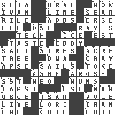 ACROSS 1. Bristle 5. Of the mouth 9. At this time 12. "Terrible" tsar 13. Actor's bit 14. Dry up 15. Cause heat under the collar 16. Does sums 17. Celtic language 18. Pipe bend 19. Order of Saint Francis (abbr.) 21. All-night dance parties 22. Technical work 24. Frozen water 26. Eastern Standard Time (abbr.) 27. Clothes sense 28. Whirlpool 29. Table seasoning 30. Fathers 32. 43,560 square feet 36. Woody plant 37. Heredity factor (abbr.) 38. Supercomputer manufacturer 39. Domed church section 40. Moves on water 42. Casino tip 43. American tennis player Robert 44. Came up 46. Fast jet (abbr.) 49. Modern: prefix 50. Religious women 51. Tarsus (plural) 53. Compass dir. 54. Armed conflict 57. Mitch Miller's instrument 58. Russian ruler of old 61. Short-tailed, large-bodied rat 62. Moving, as bait 63. Australian parrot (variant) 64. SW Asia republic 65. Compass dir. 66. ____ d'Azur (French Riviera) 67. Singer Brickell DOWN 1. Title for a man of rank and authority 2. Morally bad or wrong 3. Baron Munchausen's specialties 4. One (Scot) 5. Norwegian king 6. To free from 7. Also 8. French article 9. Effrontery 10. Fertile tracts in a desert 11. Take or capture by force 14. Ocean 19. Sep. follower 20. "______ My Girl" (Turtles hit) 21. Marina Del _, California 23. First name in cosmetics 24. Perfect 25. Music discs 27. Canvas cover 28. Bert's buddy 29. R.R. building 31. Potato state 32. Gambison 33. What you're doing now 34. Immoral or dissolute person 35. Sight organ 40. Compass dir. 41. Without 43. Cuckoo 45. Regret 46. Fur scarf 47. Unit of acoustic absorption 48. Collection of objects 52. Perceive with the eye 53. 4th largest of the Great Lakes 55. Mountain range southwest of Kyrgyzstan 56. French philosopher Descartes 58. Affectionate concern, for short 59. "Barney Miller" actor Jack 60. Nonscientific branch of learning 61. Compete