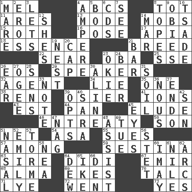 ACROSS 1. Cartoonist voice _ Blanc 4. Lettered men learn these first 8. Small child 11. Ancient Greek god of war 13. Method 14. Disorderly crowds 15. Writer of Portnoy's Complaint (1969) 16. Airs 17. Capital of Western Samoa 18. Core 21. A special lineage 22. Burn superficially 23. Chief or king in Benin or Nigeria 25. Compass dir. 26. Greek goddess of the dawn 29. Orators 32. Representative 34. Falsehood 35. Single 38. Western Nevada city 39. Flexible twig of a willow tree 41. Charged particles 43. Eastern Standard Time (abbr.) 44. Baking dish 45. Evade 46. Plea 50. Male child 51. Remaining after all deductions 54. White ___ sheet 55. Institutes legal proceedings 57. Amid 59. French poetic form 63. Title for a man of rank and authority 64. "You Light Up My Life" star Conn 67. Arab leader 68. _ mater 69. Makes supply last 70. Baby powder 71. Sodium hydroxide 72. Gone 73. It is so DOWN 1. Female horse 2. Greek god of love 3. Allows 4. Electrical Unit 5. Sometimes accompanies a hiss 6. Music discs 7. Perceive with the eye 8. Drinks excessively 9. Off-Broadway awards 10. Sadhe (variant) 12. "______ My Girl" (Turtles hit) 14. Make imperfect 19. A home for chicks 20. Head covering 21. Long, evenly shaped piece 23. Migrant worker of the '30s 24. Fermented drink made from hops 26. Ewer handle 27. Double curve, resembling the letter S 28. Elected reps. 30. Place in a line 31. The visible part of the earth's surface 33. Observe 36. Good sense 37. Inside; within (prefix) 39. Chooses 40. "Two Mules for Sister ____" 42. Elected rep. 45. Sight organs 47. Tired old horse 48. Help 49. Third day of the wk. 51. Relating to the nose 52. Poet Dickinson 53. Singer Mel 56. Proofreading order 58. Teachers' org. 60. "If ____ say so..." 61. "Death on the ____" 62. Arches 64. Morning condensation 65. Mamie's mate 66. Lair