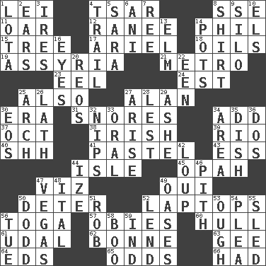 ACROSS 1. Luau accessory 4. Russian ruler of old 8. Compass dir. 11. Boat paddle 12. Indian princess (variant) 14. Silvers or Donahue 15. Woody plant 17. Satellite of Uranus 18. Petroleums 19. Nineveh was its capital 21. Paris' subway 23. Snakelike fish 24. Eastern Standard Time (abbr.) 25. In addition 27. ____ Jay Lerner 30. Epoch 31. Sounds asleep 34. Say or write further 37. Sep. follower 38. From or relating to Ireland 39. River (Sp.) 40. Quiet! 41. Soft color 43. Curvy letter 44. Small island 45. Brightly colored fish 47. Namely 49. Fr. "Yes" 50. Prevent from occurring 52. Portable computers 56. Ancient Roman robe 57. Off-Broadway awards 60. Frame or body of a ship 61. Hereditary estate 62. Child's nurse 63. Turn to the right 64. Begley and Asner 65. Likelihood 66. Possessed DOWN 1. Globular water bottle used in Asia 2. Hearing organs 3. Angers 4. Lag or linger behind 5. "Two Mules for Sister ____" 6. Cuckoo 7. To sift 8. Chest covering 9. Grain storage tower 10. Raised railways 13. Shade tree 14. Cooking vessels 16. Sight organs 20. Vintage cars 22. Car or cant ending 25. Bowlike part 26. Thin strip of wood or metal 27. Originate 28. For fear that 29. American tennis player Robert 30. Greek goddess of the dawn 32. Pinches, bites 33. Spoken 34. Type of rug 35. Food container 36. Two (Sp.) 42. Central Nebraska county 44. Ending with capital 46. Heart or essence 47. Viva Las _ 48. Slanted text style (abbr.) 49. Fertile tracts in a desert 50. Texas town _ City 51. Director Reiner 52. Grant temporary use of 53. Ending for "Through" and "Enough" 54. Entreaty 55. Downhill vehicle 56. Third day of the wk. 58. Oct. 31 cry 59. Indiana (abbr.)