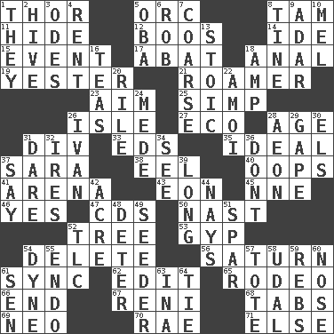 ACROSS 1. Son of Odin 5. The grampus (Milton) 8. Scottish cap 11. Flintstone garb 12. Expressions of contempt or scorn 14. Binary compound 15. Incident 17. Blind as ____ 18. Of or related to the anus 19. Next before 21. Wanderer 23. Direct toward a target or goal 25. Simple or foolish person 26. Small island 27. Environmental prefix 28. Personal question 31. HTML Container Element 33. Begley and Asner 35. Standard of perfection 37. "Two Mules for Sister ____" 38. Snakelike fish 40. I made a mistake 41. Sports stadium 43. Period of immesurable duration 45. Compass dir. 46. Consenting reply 47. Music discs 50. Political cartoonist Thomas 52. Relationship diagram 53. Swindle 54. Erase 56. Titan orbits this 61. Synchronize (abbr.) 62. Prepare for publication 65. Cowboy competition 66. Conclude 67. Painter Guido (1575-1642) 68. Bar bills 69. Modern: prefix 70. Actress Charlotte 71. Otherwise DOWN 1. Those people 2. Hub of activity 3. Lyric poems 4. Monthly bill 5. Chief or king in Benin or Nigeria 6. Director Reiner 7. Unrefined 8. Prong on a fork 9. The sixth month of the Jewish calendar 10. Cartoonist voice _ Blanc 13. Unemotional 16. Afternoon social gatherings 18. Electrical Unit 20. Cause heat under the collar 22. Mine, in Marseilles 24. Ancient Persian 26. _ the terrible 28. Period of immesurable duration 29. Yawn 30. Raised railways 31. Have the gumption 32. Angers 34. Perceive with the eye 36. Do not 37. Declare 39. Protracted 42. Land measure 44. Negative votes 48. Prevent from occurring 49. Sowing specialist 51. Practice fight 52. Affectionate concern, for short 54. Unit of force 55. Inside; within (prefix) 57. Carryall 58. Allodial 59. Confederate soldiers (slang) 60. Characteristic smell of wine 61. Elected rep. 63. _ tizzy (2 wds.) 64. Standoff