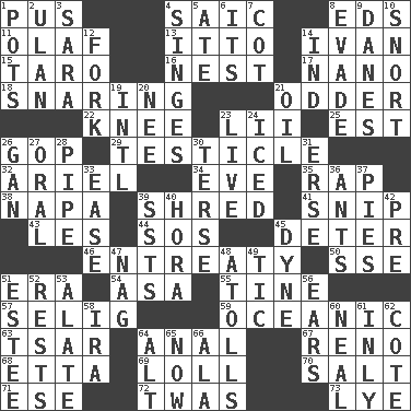 ACROSS 1. Product of festering 4. Ketch in the Levant 8. Begley and Asner 11. Norwegian king 13. "Tell ____ the Marines!" 14. "Terrible" tsar 15. Pacific island yam 16. Egg locale 17. Billionth: prefix 18. Catching in a trap 21. More peculiar 22. Leg joint 23. Cards in a Roman deck? 25. Eastern Standard Time (abbr.) 26. Grand Old Party 29. One of the two male reproductive glands 32. Satellite of Uranus 34. Night before a holiday 35. Reproach for some lapse or misdeed 38. California wine valley 39. Fragment 41. Sever or remove by pinching or nipping 43. French article 44. Mayday 45. Prevent from occurring 46. Plea 50. Compass dir. 51. Epoch 54. White ___ sheet 55. Prong on a fork 57. Major League Baseball Commissioner Bud 59. Pertaining to the sea 63. Russian ruler of old 64. Of or related to the anus 67. Former U.S. Attorney General Janet 68. Singer James 69. Hang loosely or laxly 70. Table seasoning 71. Compass dir. 72. It was, poetically 73. Potassium hydroxide DOWN 1. Cooking vessels 2. ____ Bator 3. "Two Mules for Sister ____" 4. Burns superficially 5. Had dinner 6. It is 7. Small bed 8. Elude 9. Natives or inhabitants of Denmark 10. Derisive sound 12. Tined utensil 14. Indiana (abbr.) 19. International (abbr.) 20. Born 21. Petroleum 23. Not recorded 24. On the rocks 26. Separate the seeds from cotton 27. Spoken 28. Corncob 30. Laconic 31. Celtic language 33. Relaxation 36. Pismires 37. Sliced desserts 39. Fast planes 40. Israeli folk dance 42. Before (prefix) 45. Unit of force 47. Tired old horse 48. Ringlike coral islands and reefs 49. Nervous spasm 51. First name in cosmetics 52. Musical pauses 53. Having winglike extensions 56. Hearing organs 58. Retirement account (abbr.) 60. Actress Patricia 61. In an inward manner 62. ____ d'Azur (French Riviera) 64. Keyboard modifier key 65. At this time 66. Wing