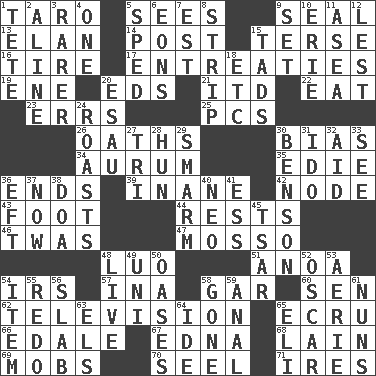 ACROSS 1. Pacific island yam 5. Observes 9. Lick closed 13. Enthusiasm 14. Mail 15. Laconic 16. Become fatigued 17. Pleas 19. Compass dir. 20. Begley and Asner 21. It would 22. Consume 23. Blunders 25. Personal Computers (abbr.) 26. Expletives 30. Prejudice 34. Gold (Symbol: Au) 35. Singer Brickell 36. Conclusions 39. Lacking in sense or substance 42. Thickened enlargement 43. 12 inches 44. Musical pauses 46. It was, poetically 47. With motion or animation 48. Nilotic language 51. Small Philippine buffalo 54. Big collection agency 57. _ tizzy (2 wds.) 58. Slender fish 60. Elected rep. 62. Household entertainment appliance 65. Shade of tan 66. Peak District village in England 67. Pulitzer Prize-winning author Ferber 68. (Had) reclined 69. Crowds into 70. Stitch closed the eyes of (a falcon) 71. Angers DOWN 1. Wig 2. Place in a line 3. More uncommon 4. Single 5. Hurried 6. Immeasurably long periods of time 7. Eastern Standard Time (abbr.) 8. Long narrow piece of something 9. Put into a specified state 10. One of the Great Lakes 11. At sea 12. For fear that 15. Small boys 18. And so on (abbr.) 20. He sold his birthright 24. Ridicules or criticizes harshly 27. Three (prefix) 28. Attila the _ 29. Excessive but superficial compliments 30. Gillaume's butler role 31. Wedding promise 32. Assist 33. Observe 36. Lizard (obsolete) 37. At this time 38. ___ good deed 40. Modern: prefix 41. Double-curved letter 45. Russian ruler of old 48. Moving, as bait 49. Corn or form start 50. Fertile tracts in a desert 52. Witty Wilde 53. Nest on high 54. Detail 55. Redecorate 56. Broad, flat, thick piece 58. Went 59. Of or related to the anus 61. Religious women 63. Raised railways 64. Binary compound 65. Biblical high priest
